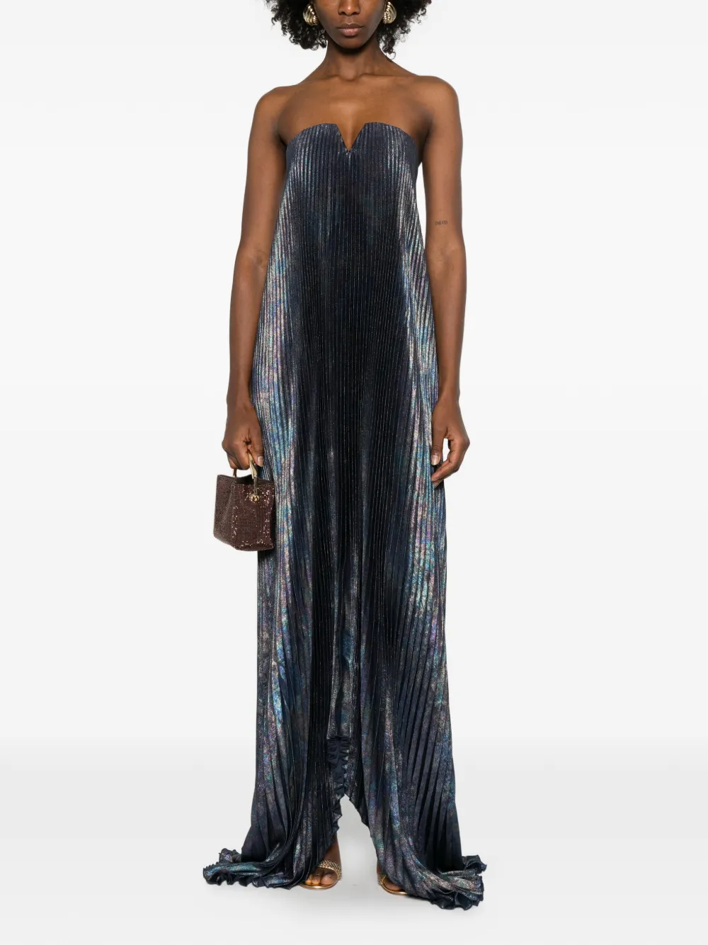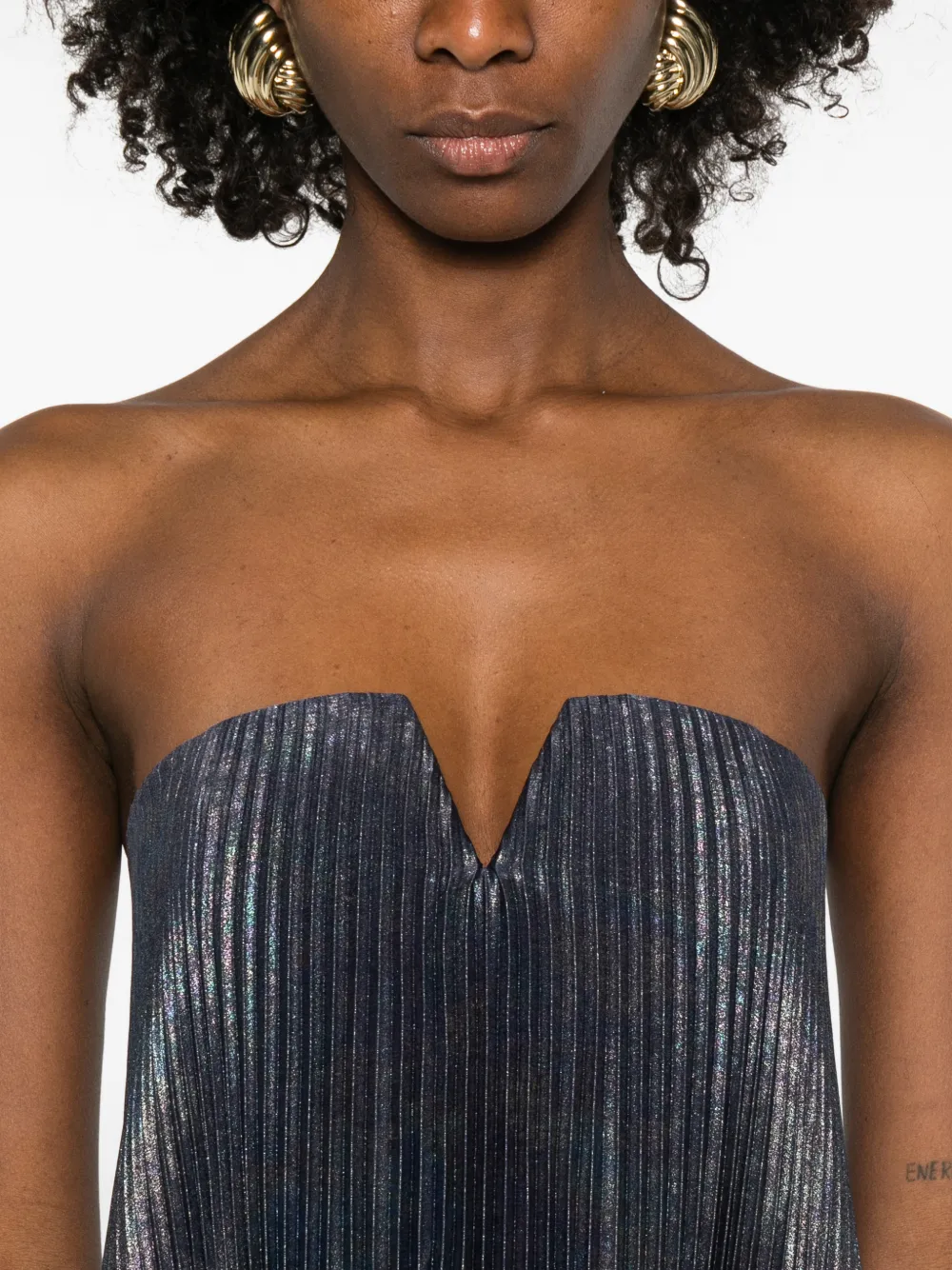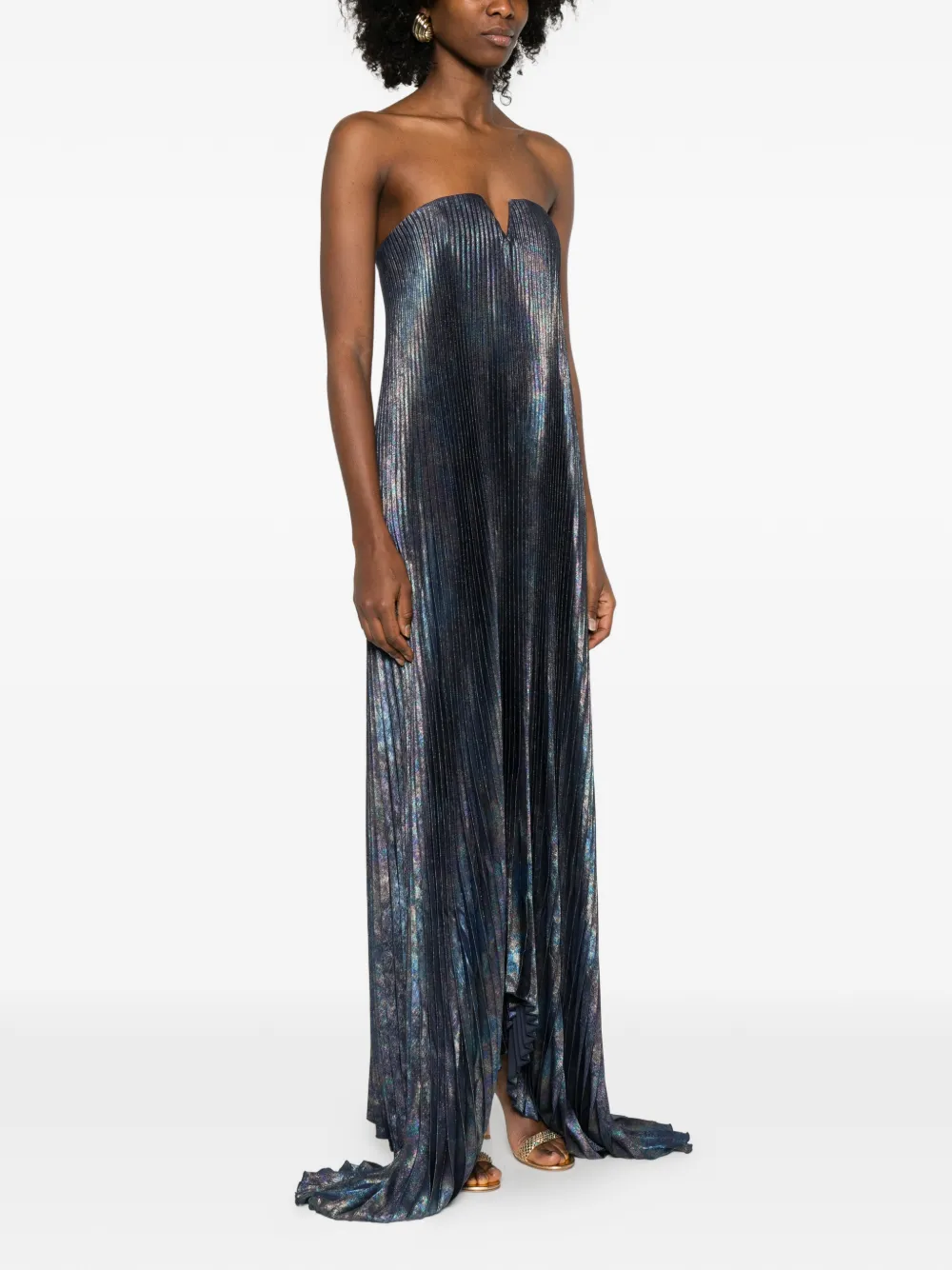 Синее плиссированное платье без рукавов с V-образным вырезом и металлическим эффектом