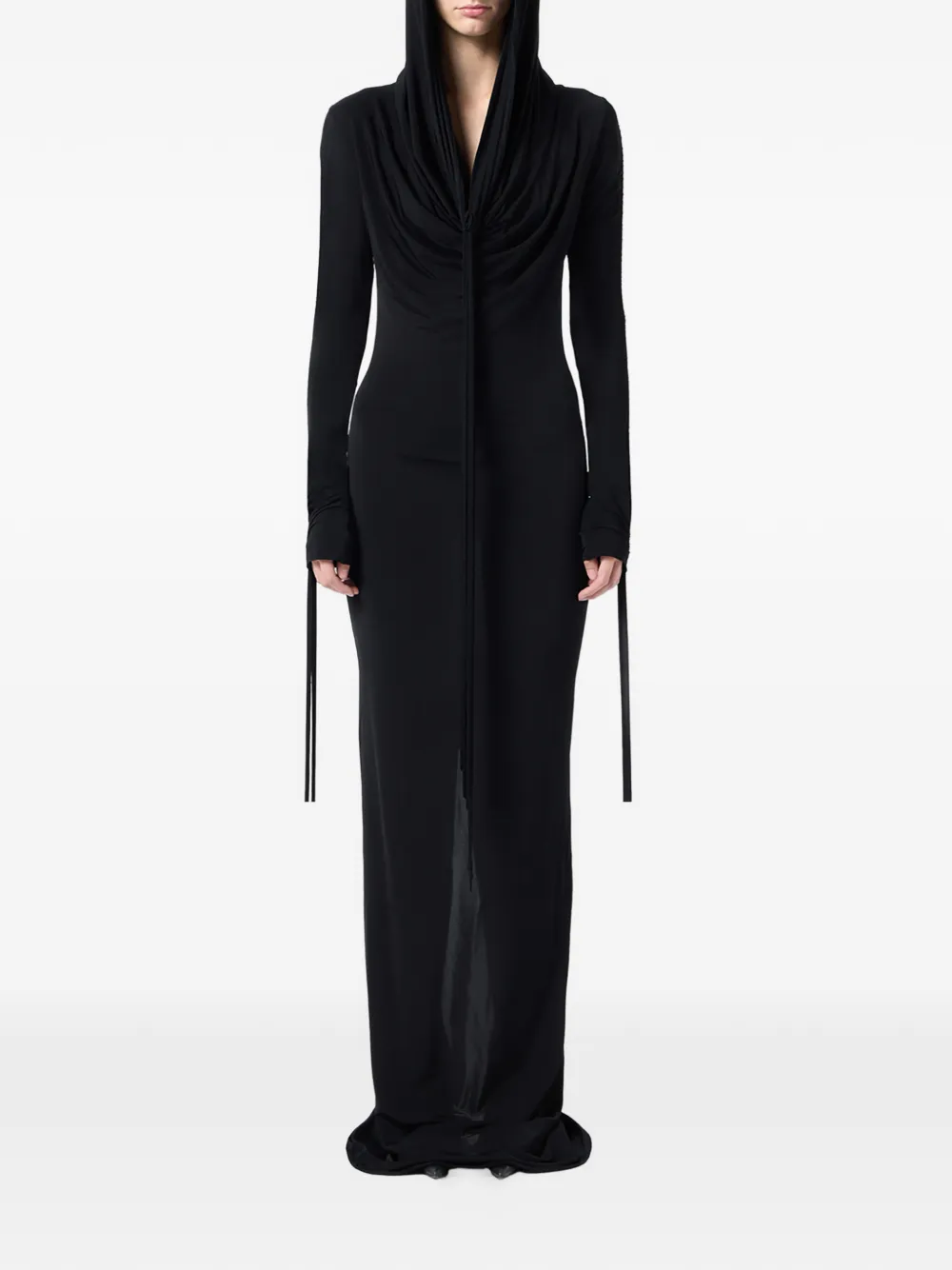 Черный капюшон, шнурки на горловине, манжеты, длинные рукава, сборка спереди, макси-длина