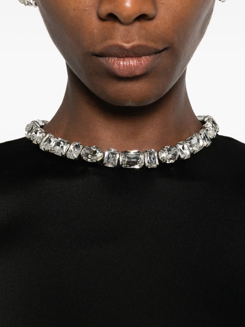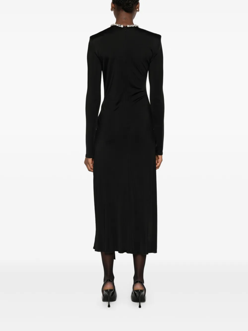 Черная отделка кристаллами на вырезе, длинные рукава, асимметричный подол, драпировка, декоративные элементы из кристаллов сбоку
