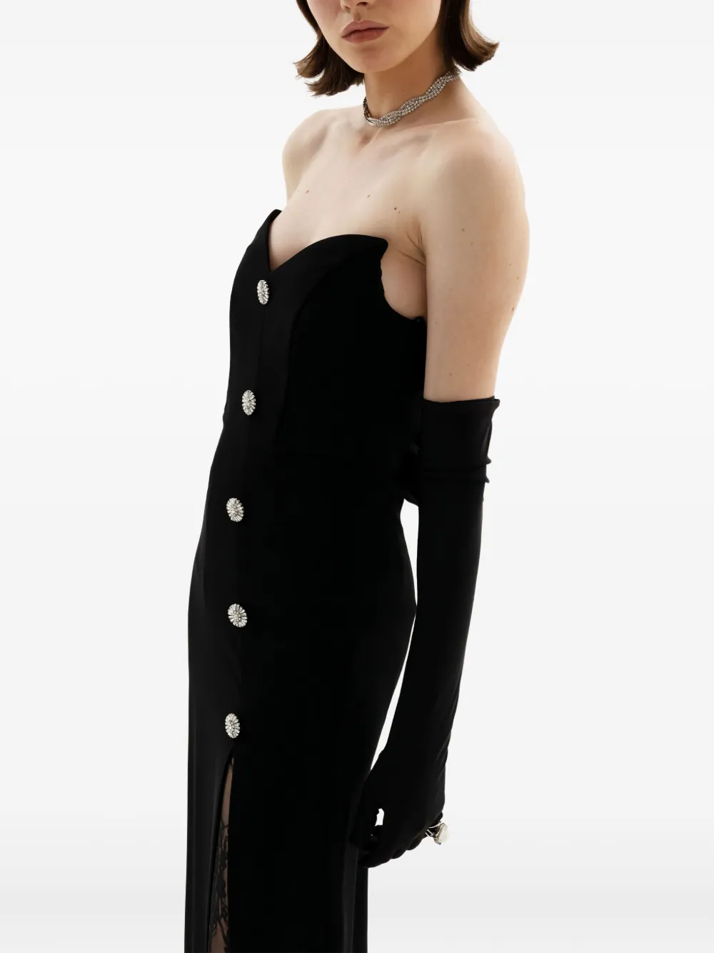 Черный бюстье (без бретелек) разрез сбоку на ноге вставка из кружева