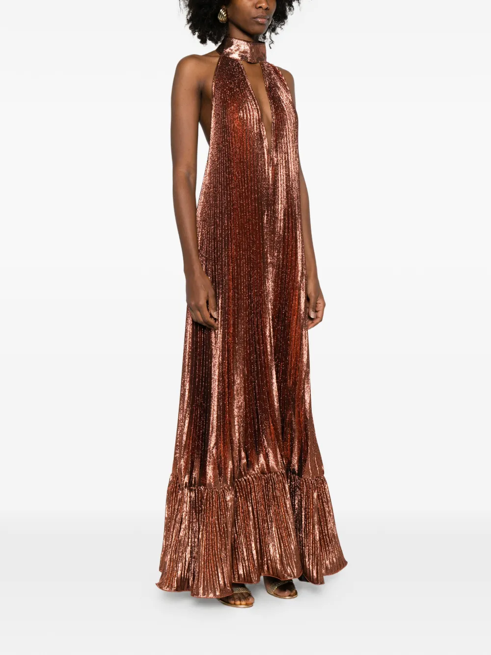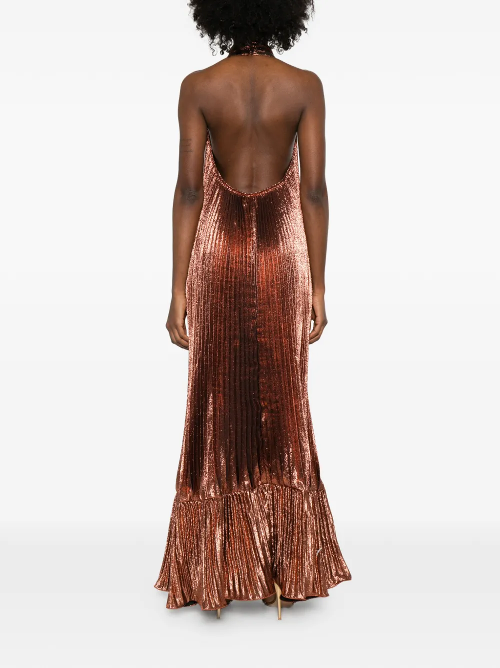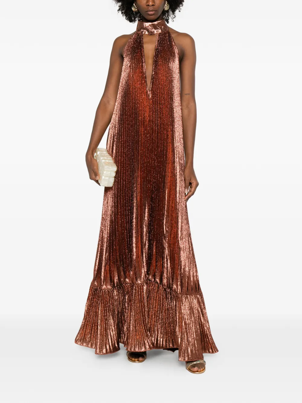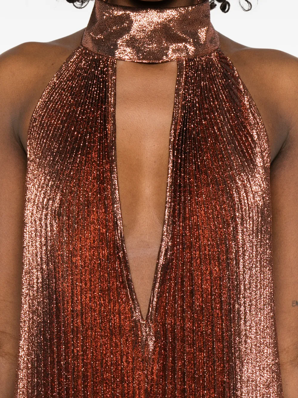 Коричневое платье с плиссировкой и V-образным вырезом на шее-холтер