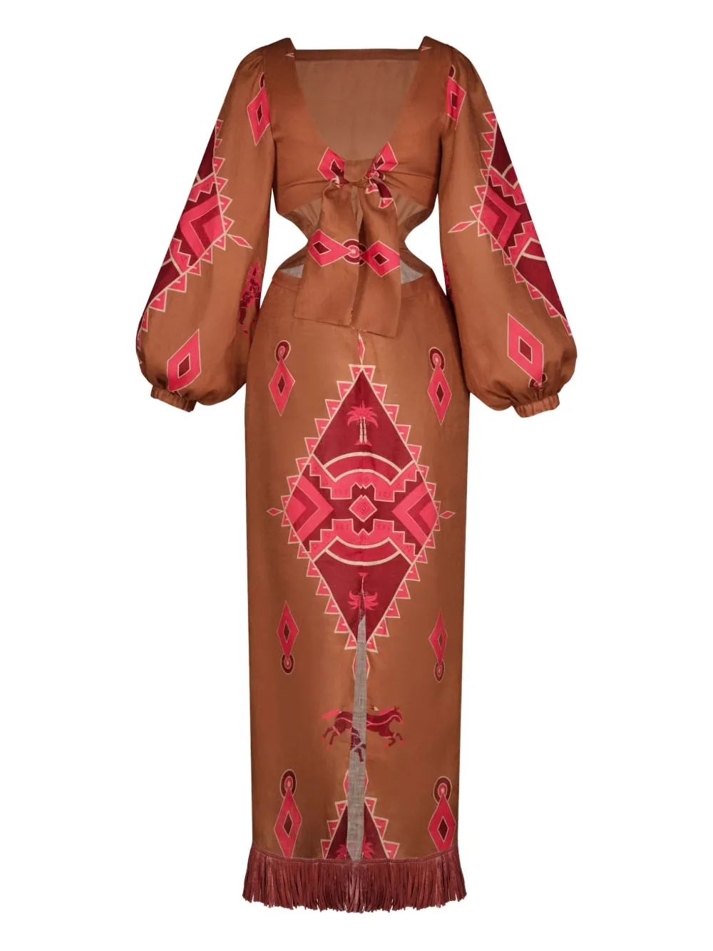Коричневый/многоцветный геометрический принт, бахрома по краю, завязка сзади, длинные рукава-баллон, вырезы, длина макси