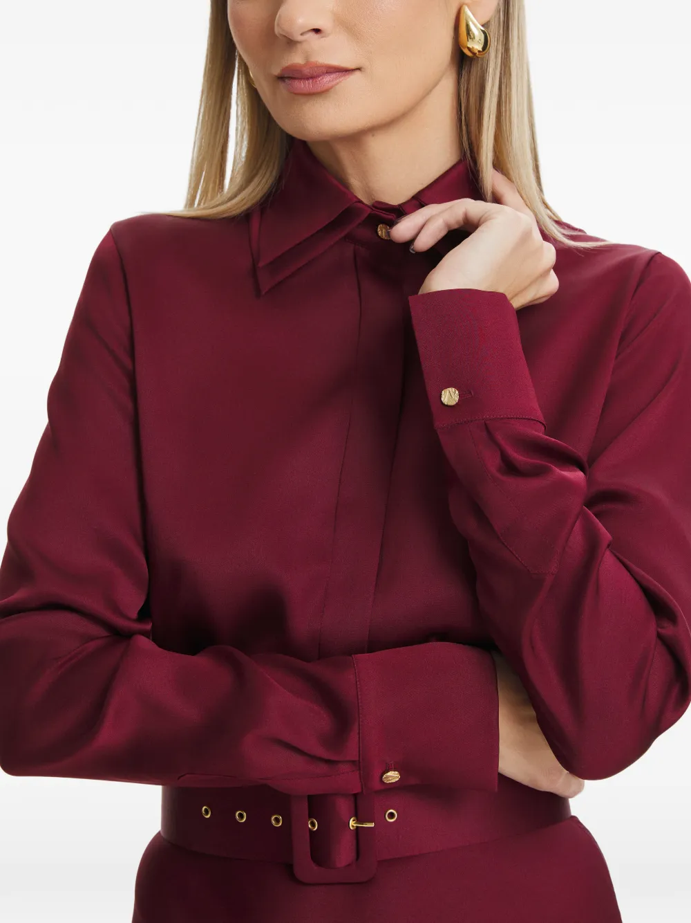 Красное платье макси с поясом на талии, манжетами на пуговицах, отложным воротником-поло и прямым подолом