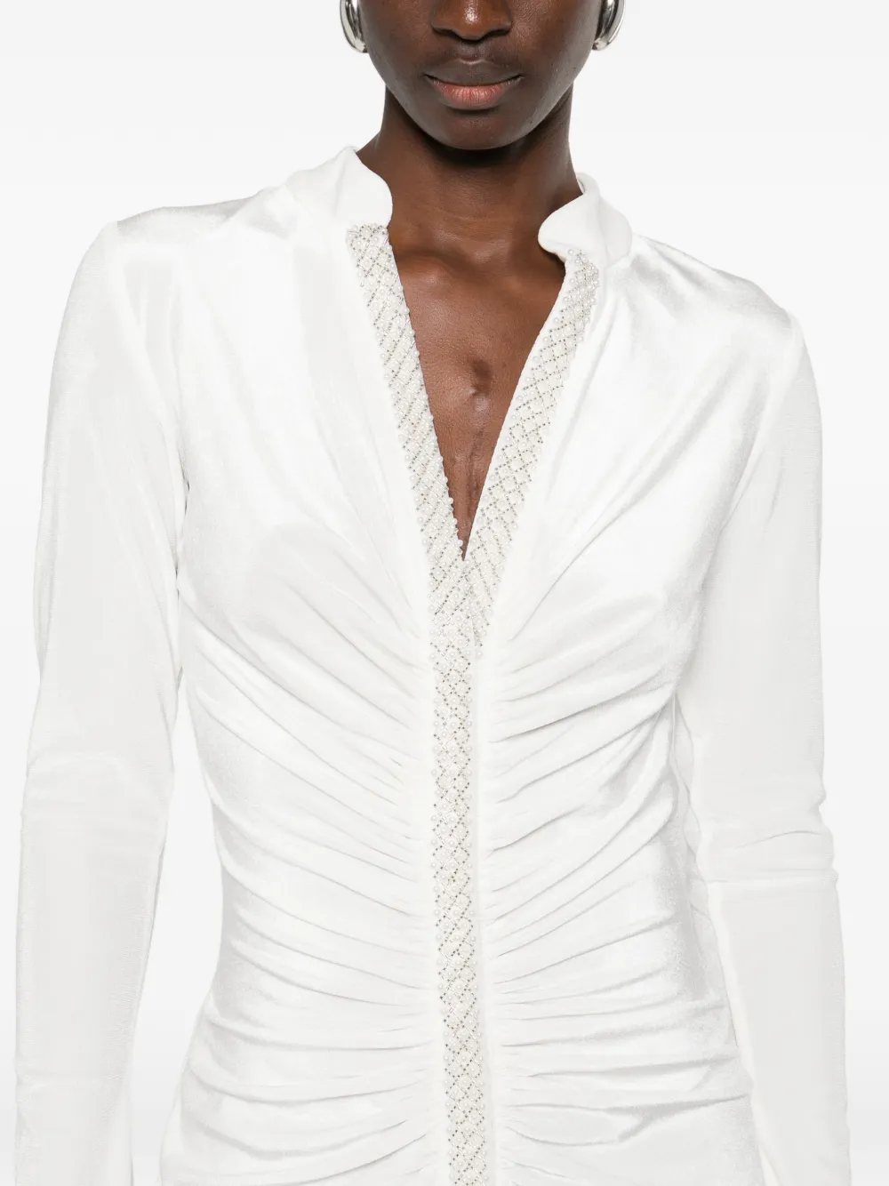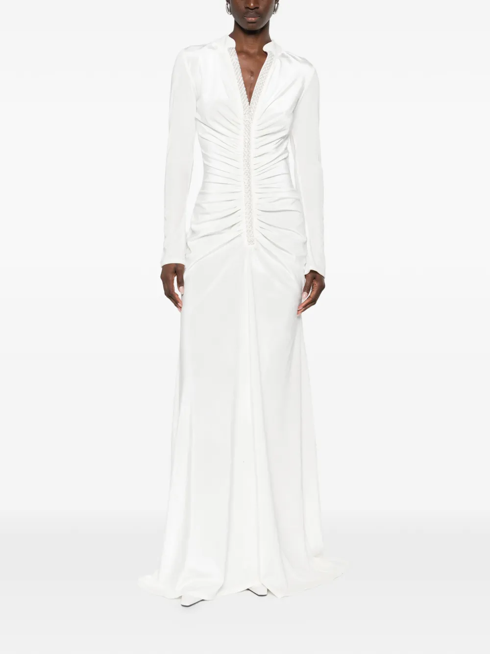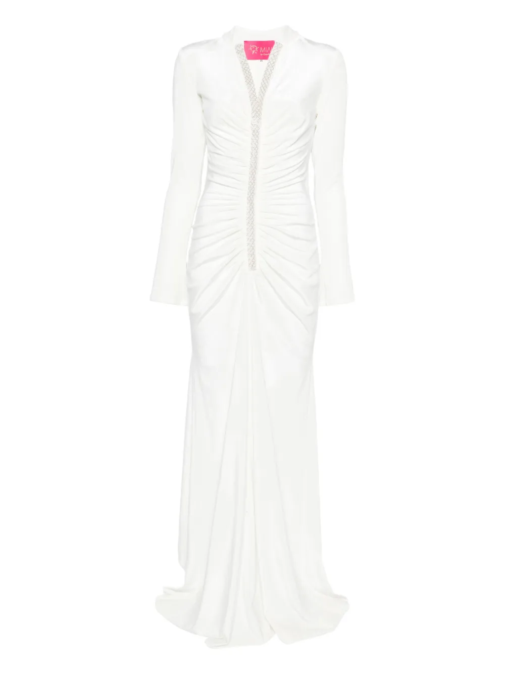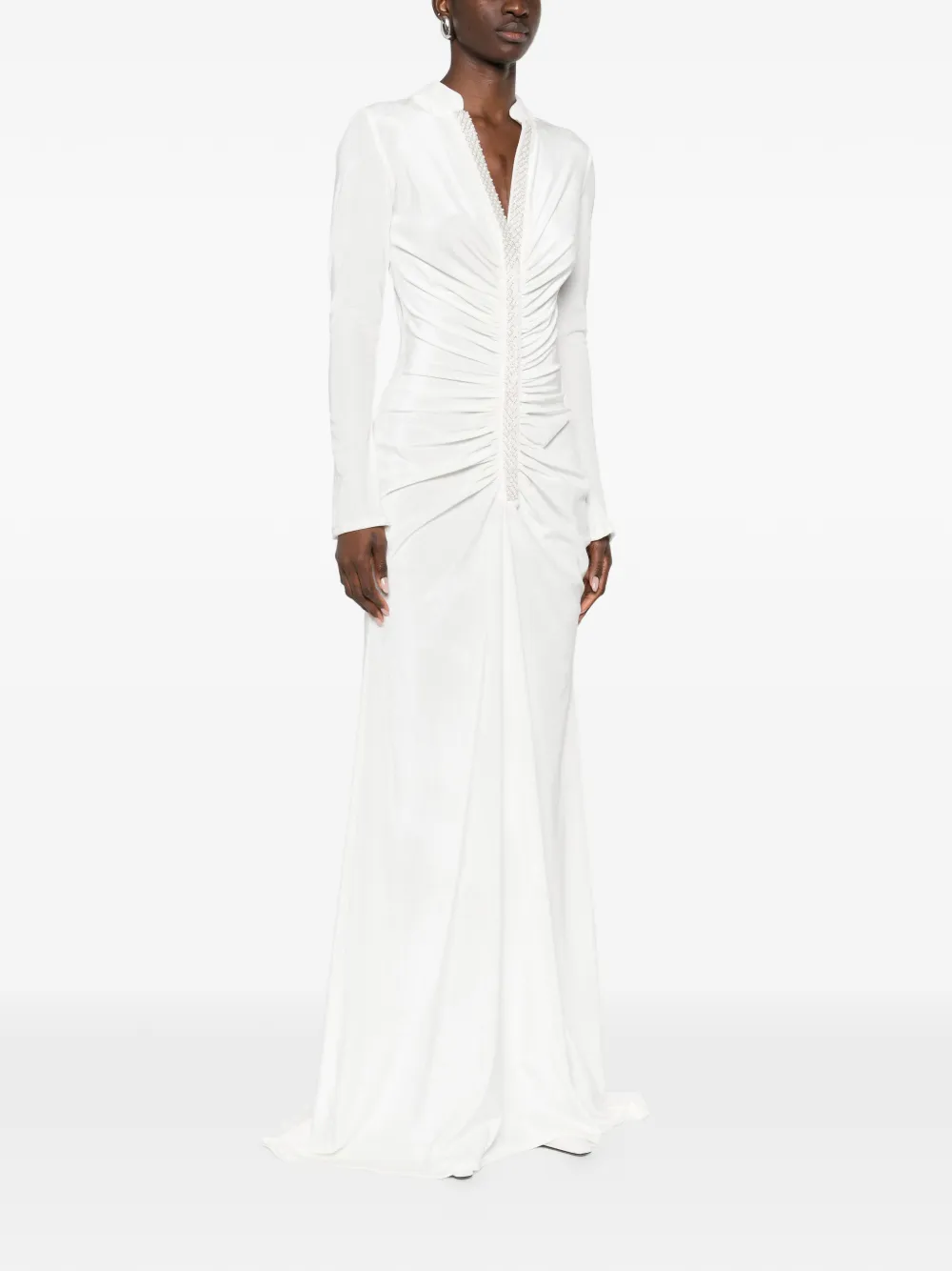 Белое платье с отделкой, украшенной декором, присборенными деталями, длинными рукавами и в пол