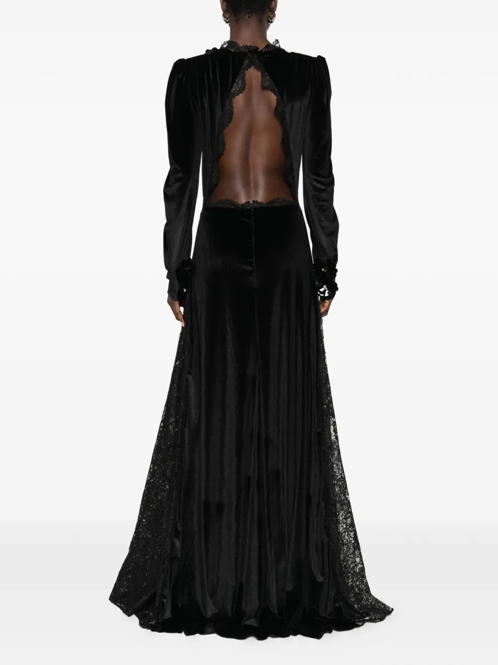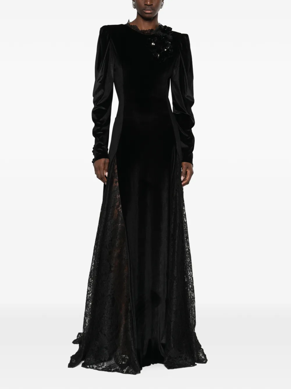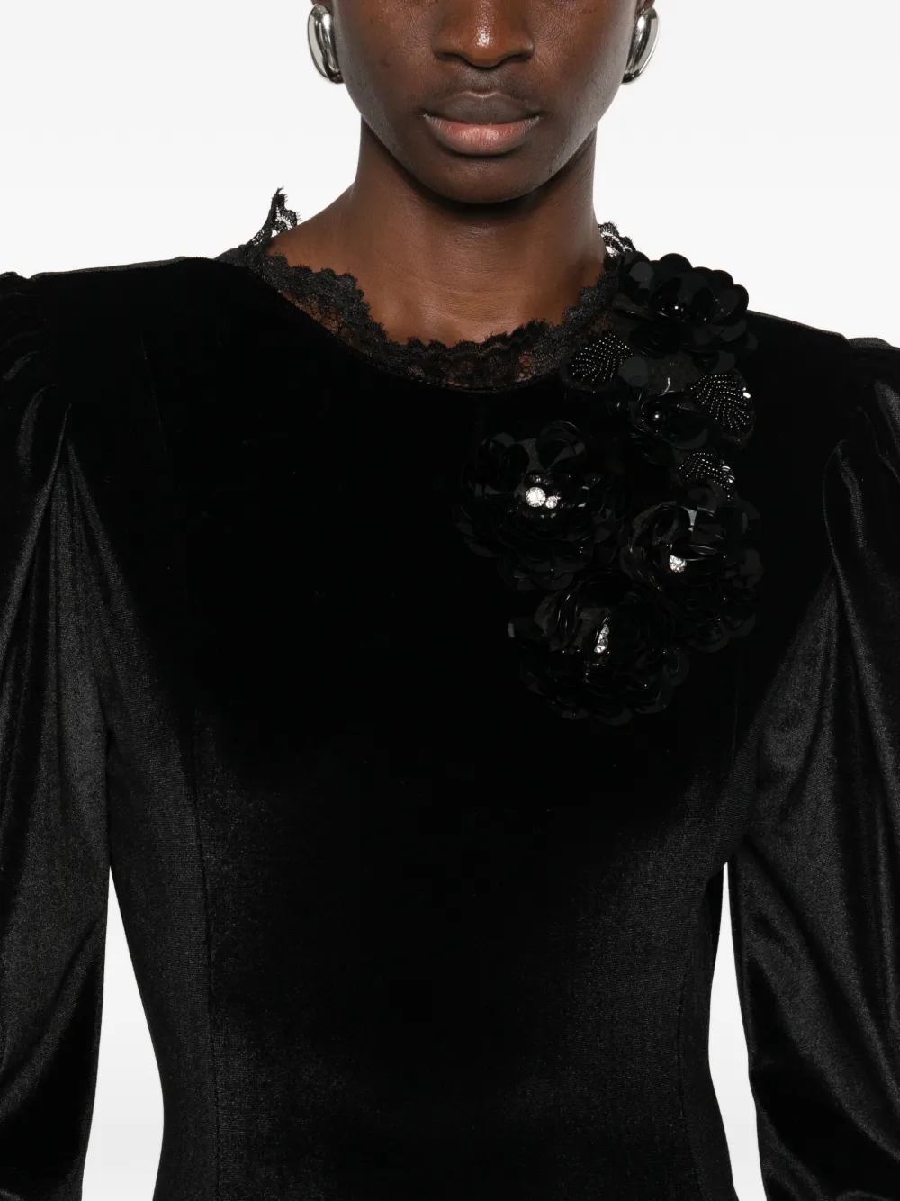 Черные кружевные детали с цветочными аппликациями, длинные рукава, круглый вырез