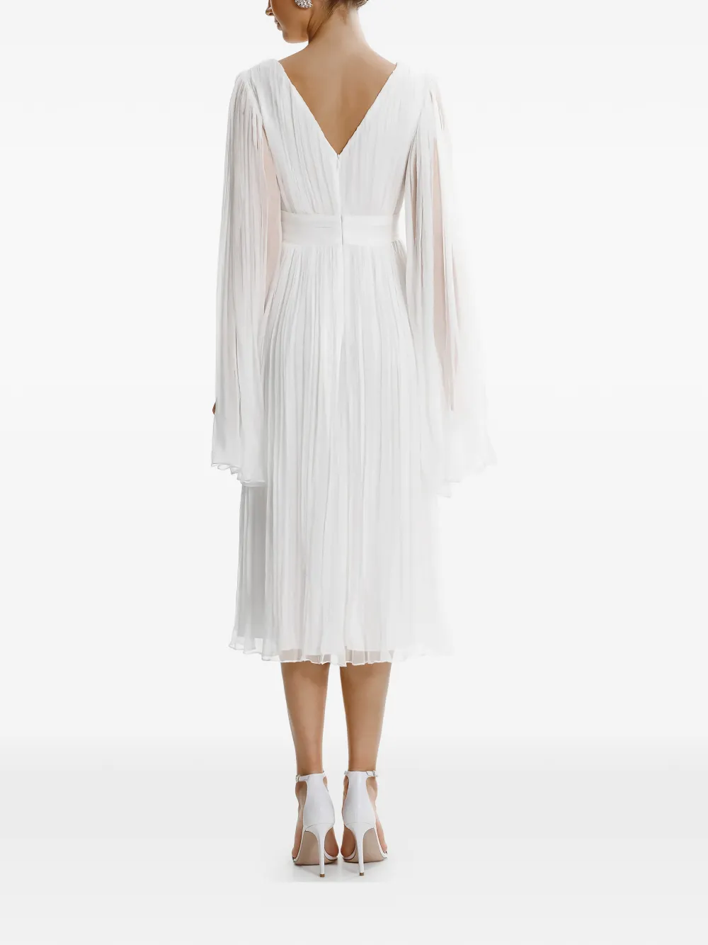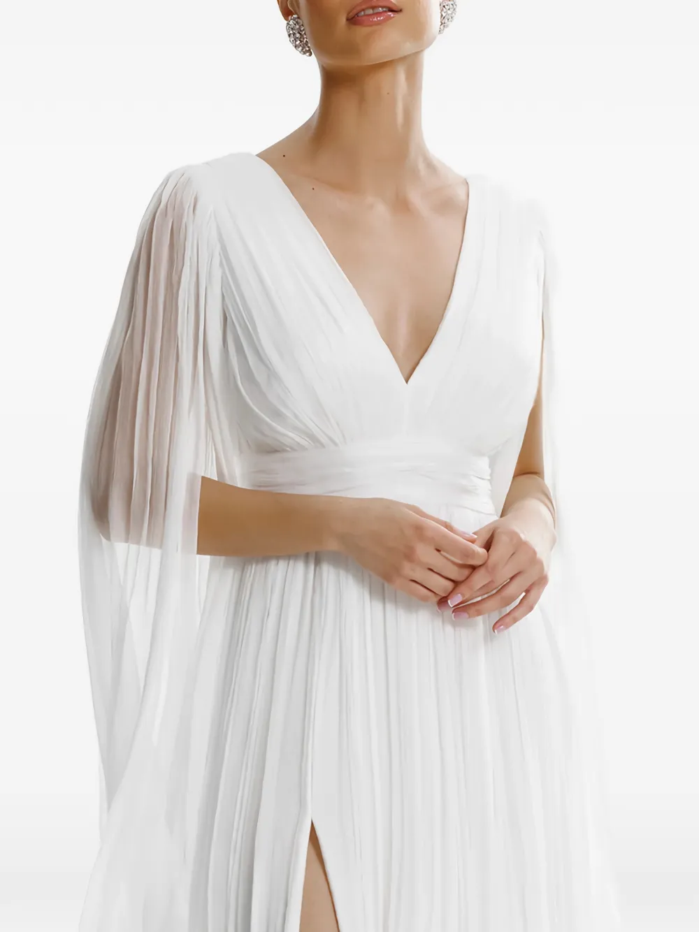 Белое платье с V-образным вырезом, длинным разрезом на ноге и длинными рукавами-накидками