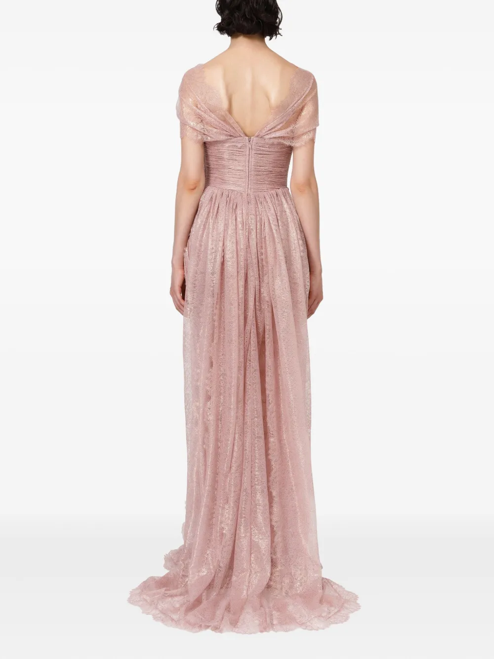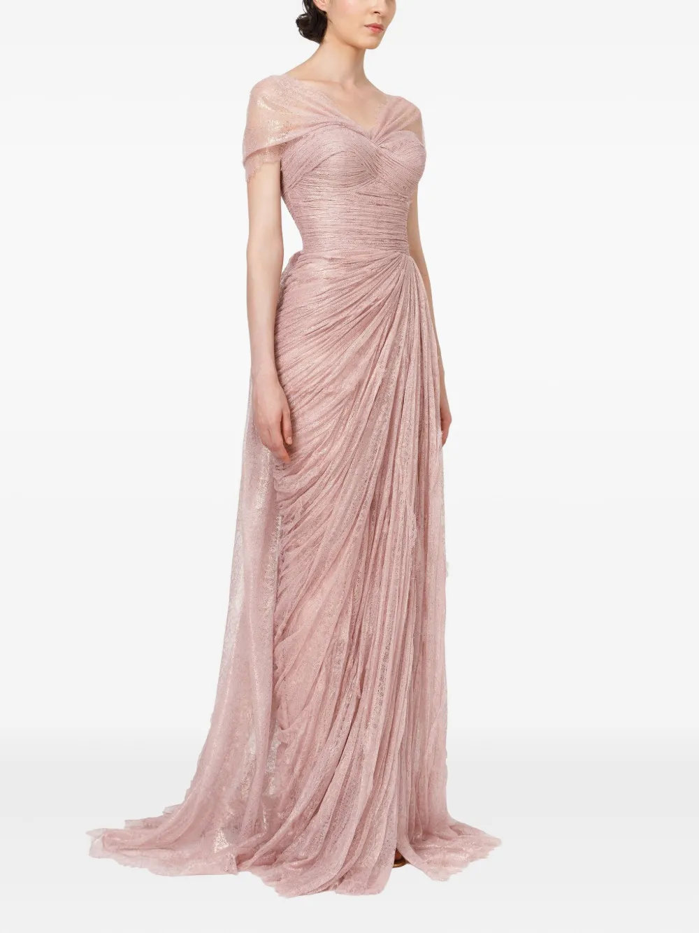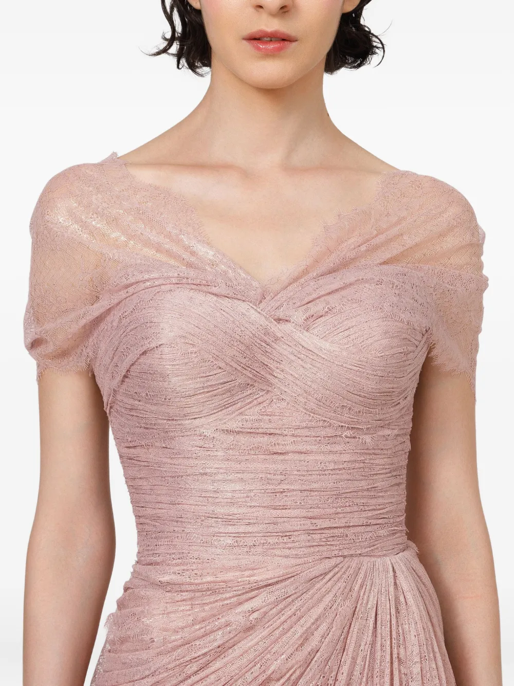 Пудрово-бежевый цветочная кружевная отделка короткие рукава V-образный вырез плиссированный лиф драпированная юбка