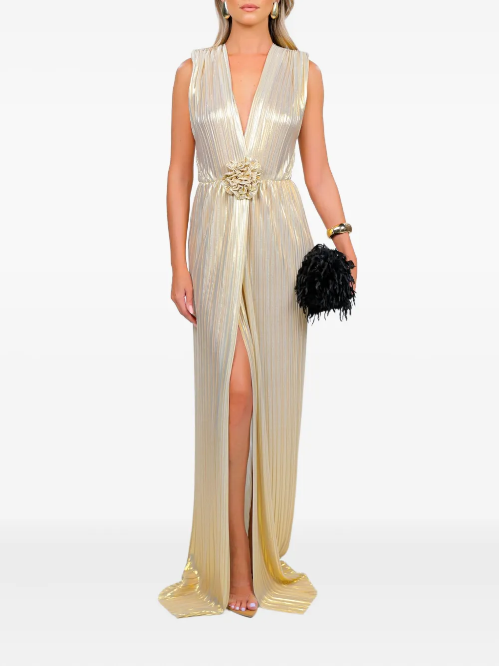 Золотистое плиссированное платье с V-образным вырезом, без рукавов, с цветочным декором и передним разрезом