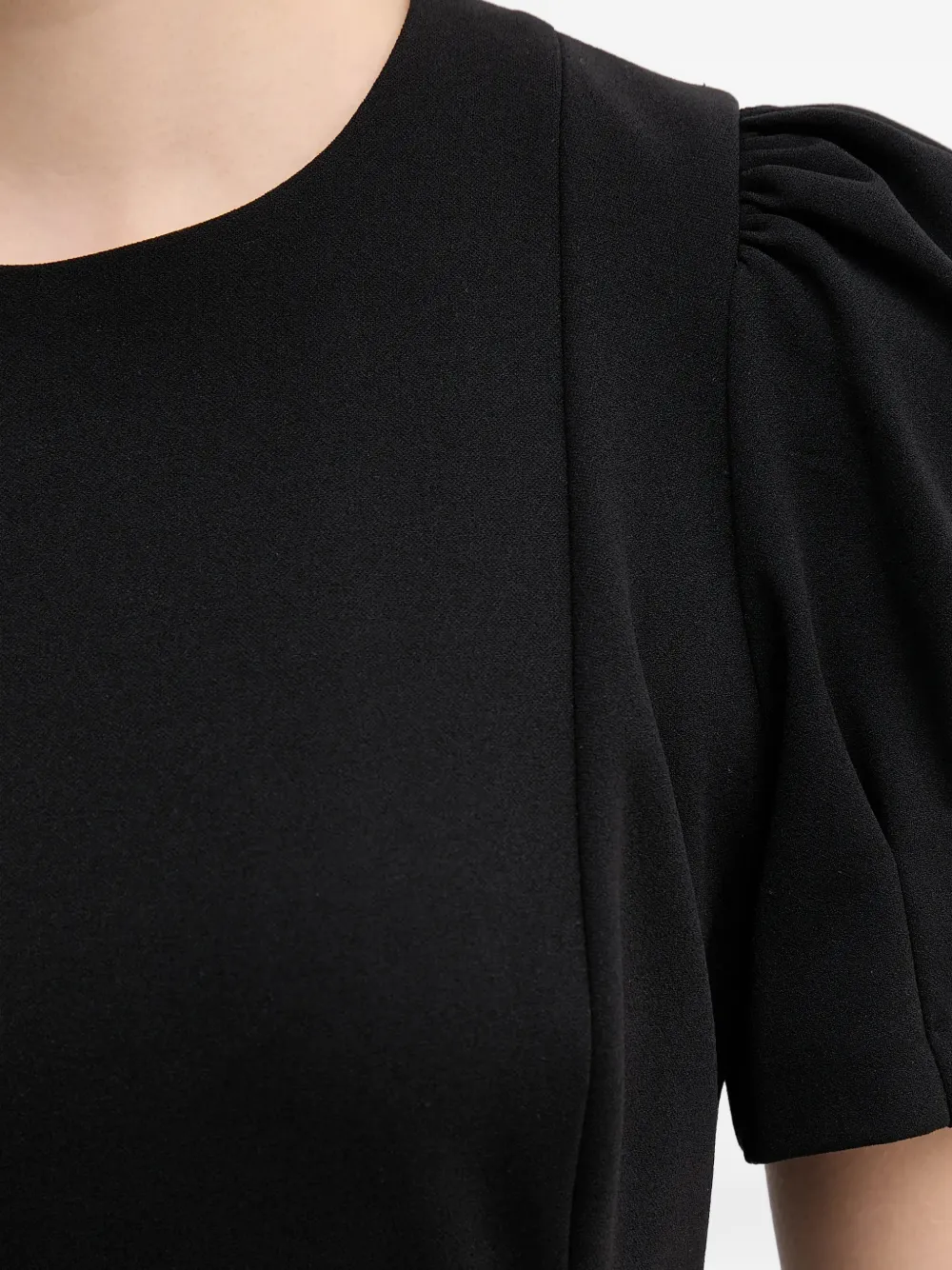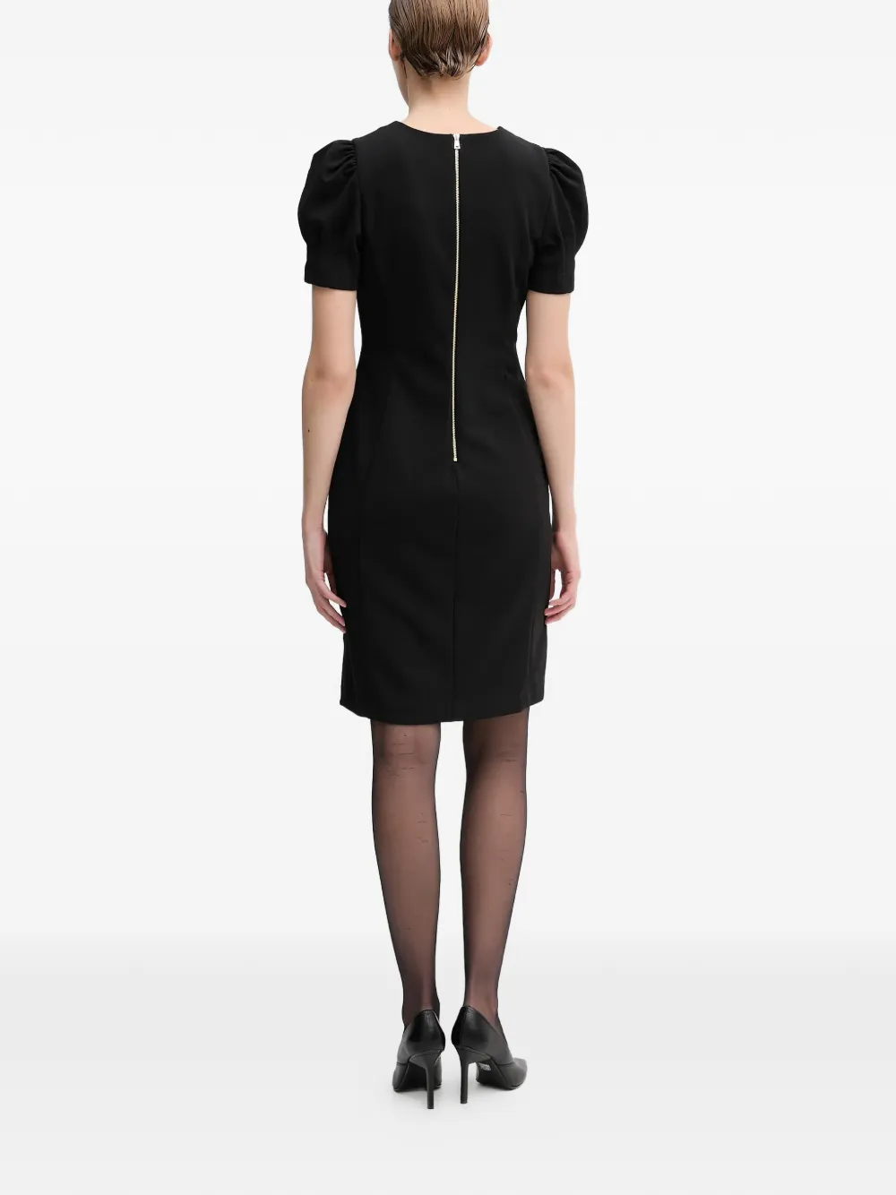 Черный цвет, короткие рукава, круглый вырез, застежка-молния сзади, облегающий силуэт, длина до колена