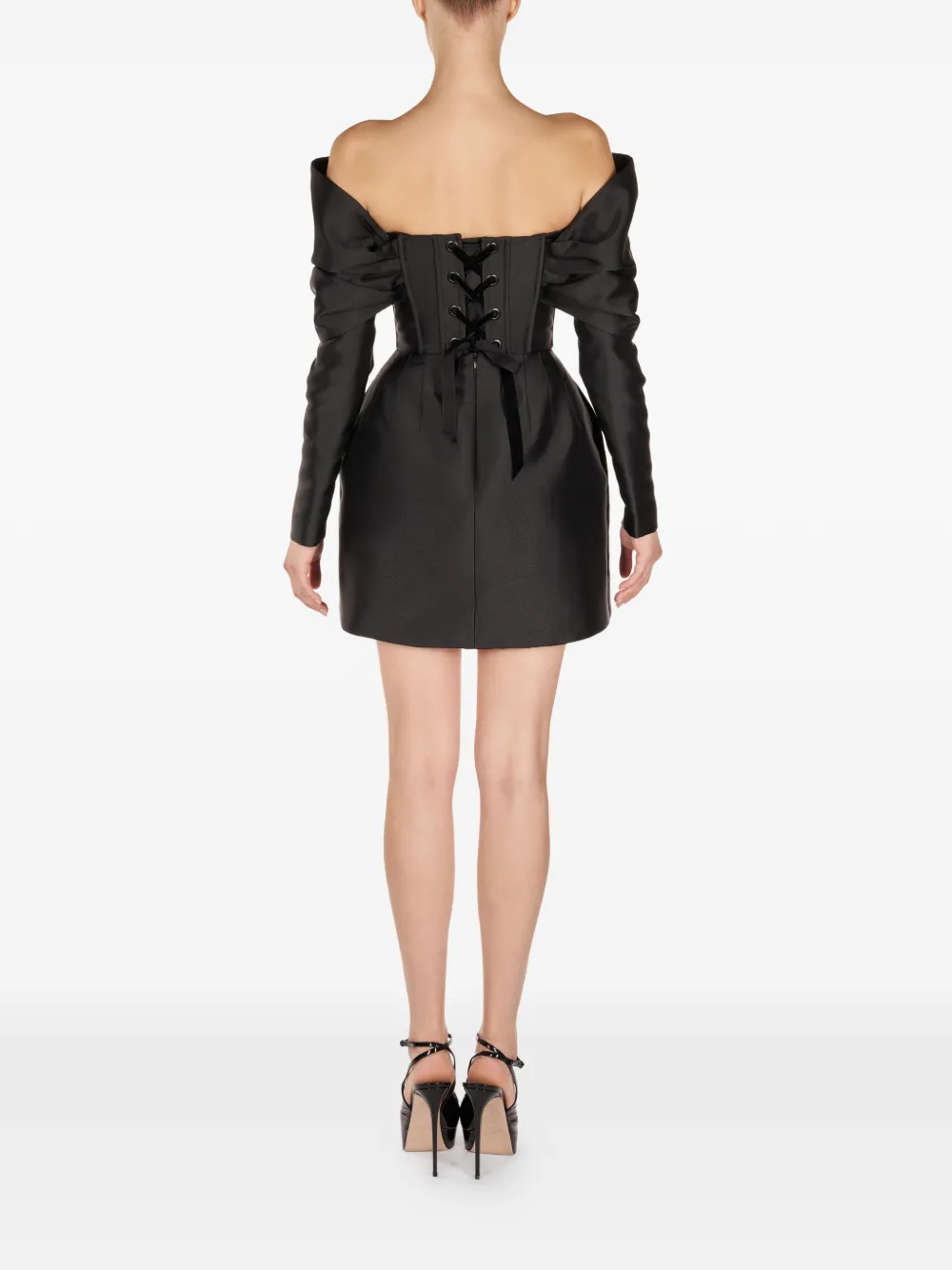 Черный топ с декоративными элементами, открытыми плечами, длинными рукавами, корсетным силуэтом и шнуровкой на спине