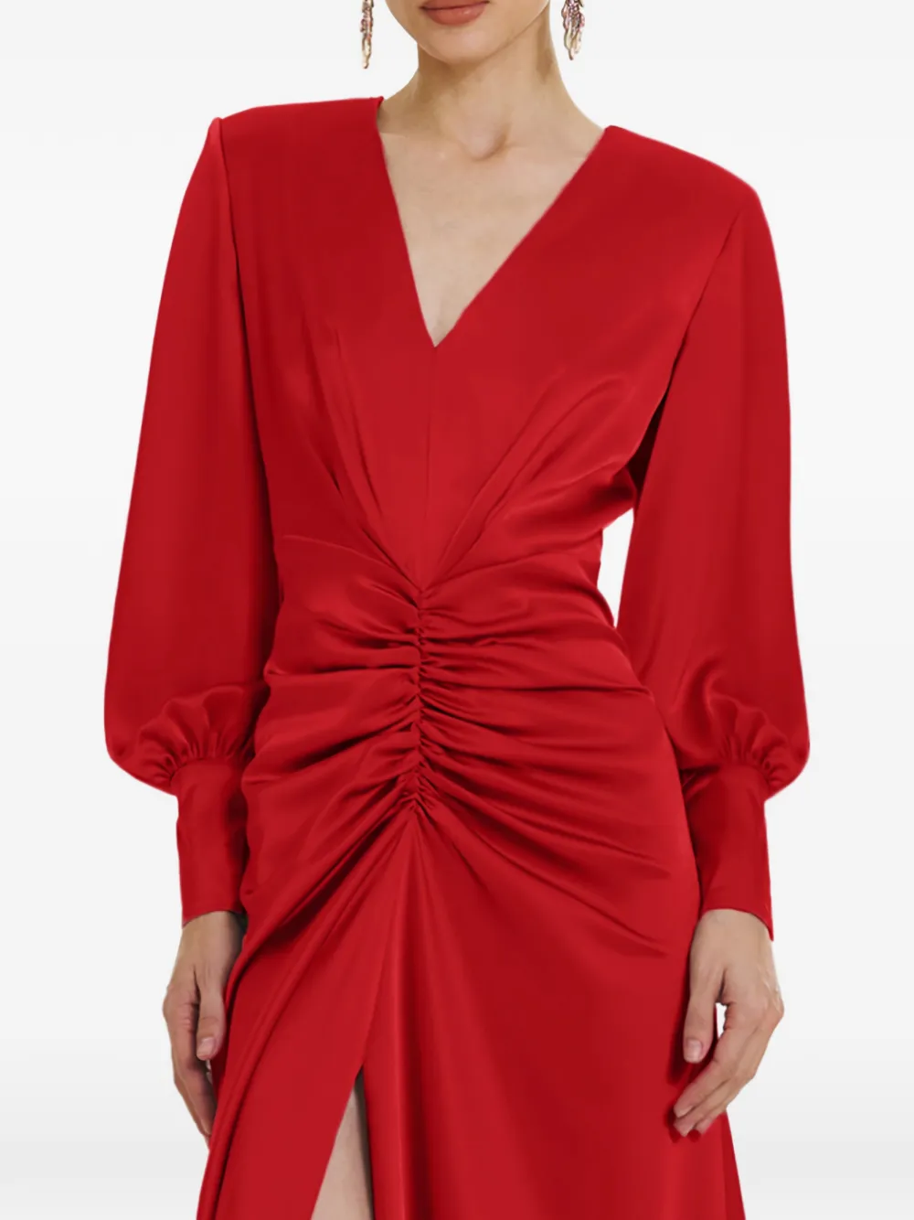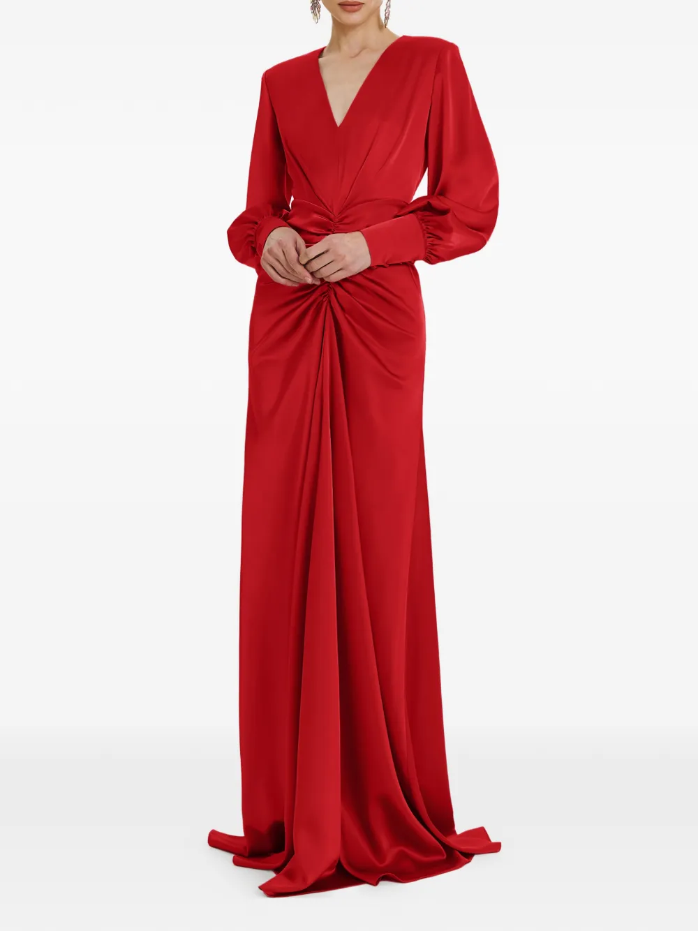Красное платье с V-образным вырезом, длинными рукавами, драпировкой, разрезом и в пол