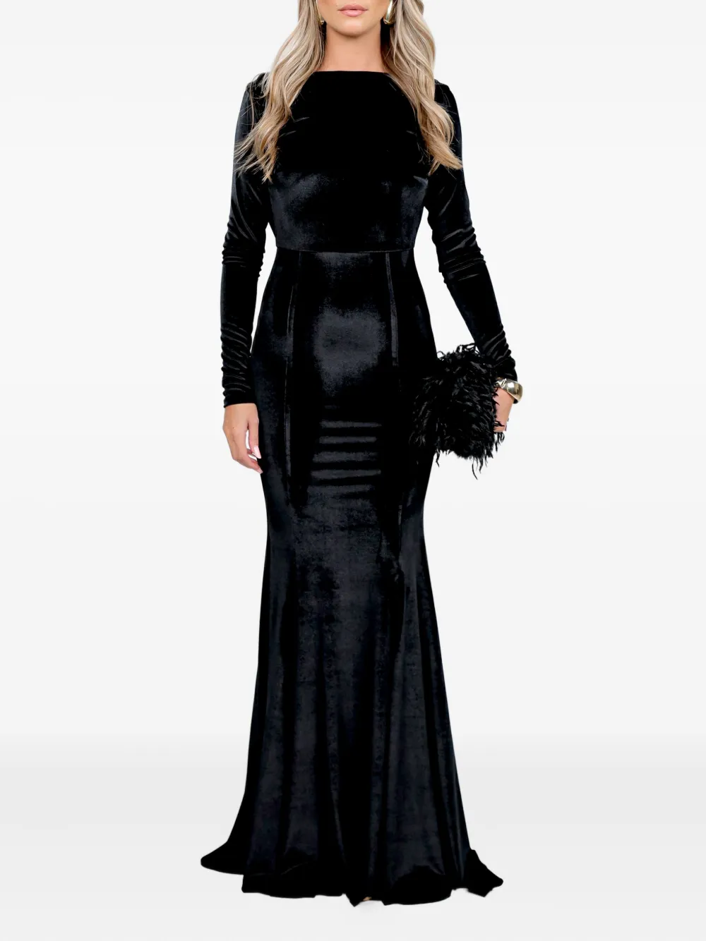 Черное платье с текстурированной отделкой, длинными рукавами, открытой спиной и длиной в пол