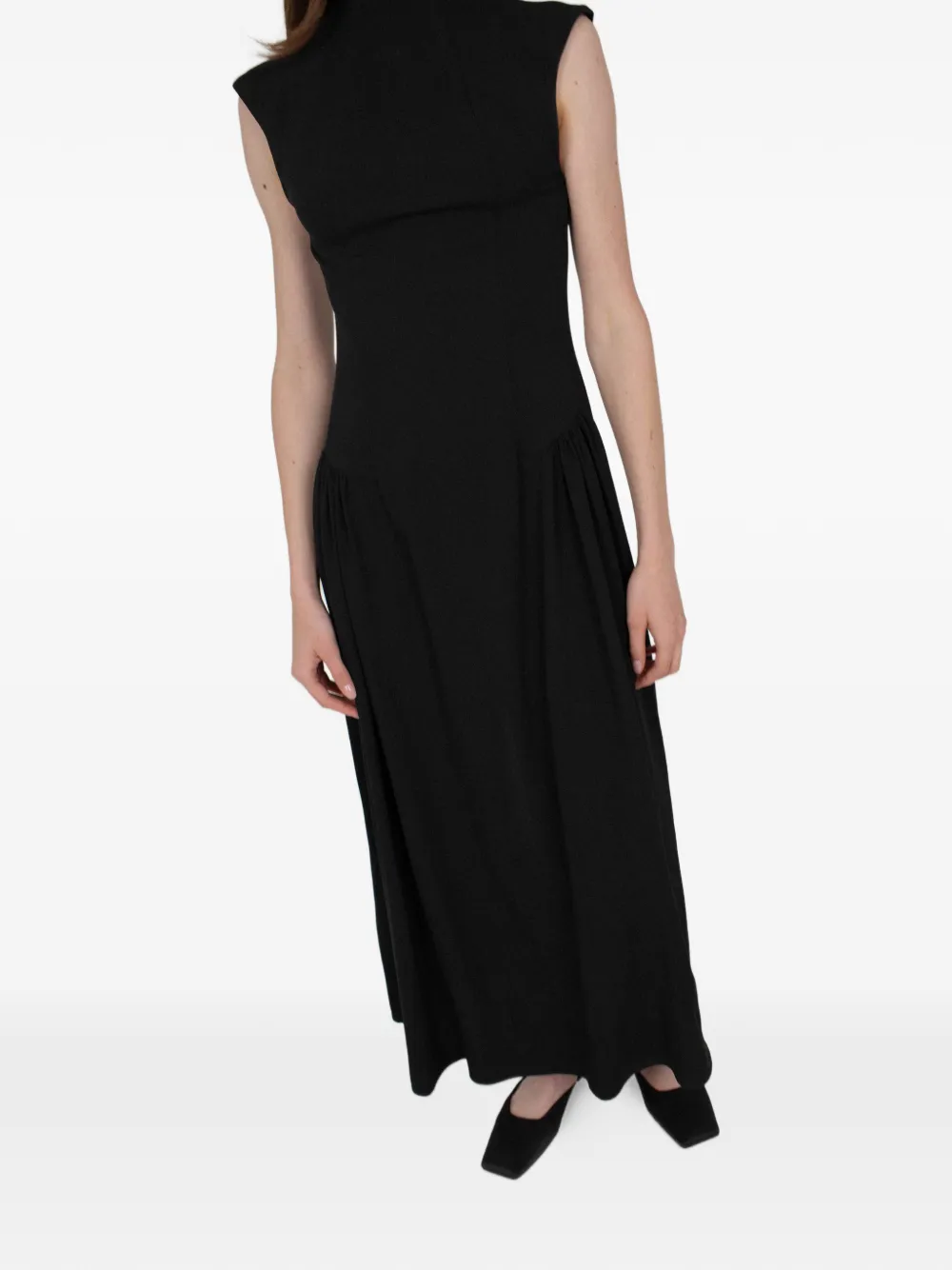 Черный топ без рукавов с высоким воротом и присборенными деталями