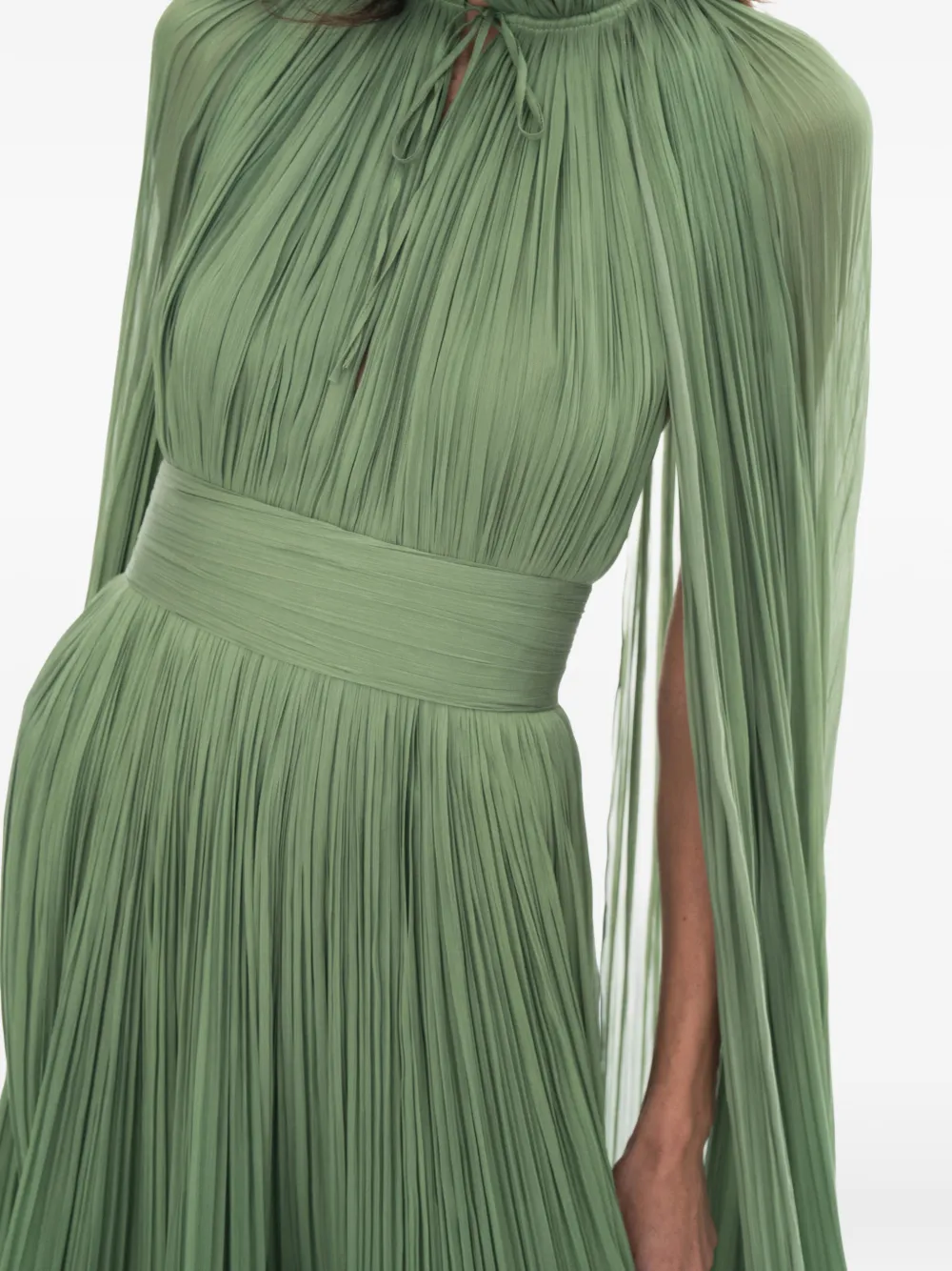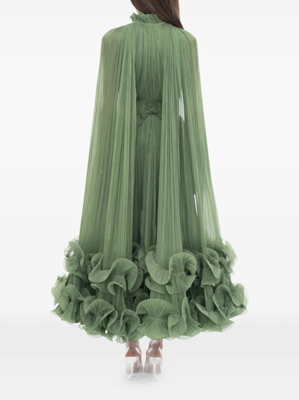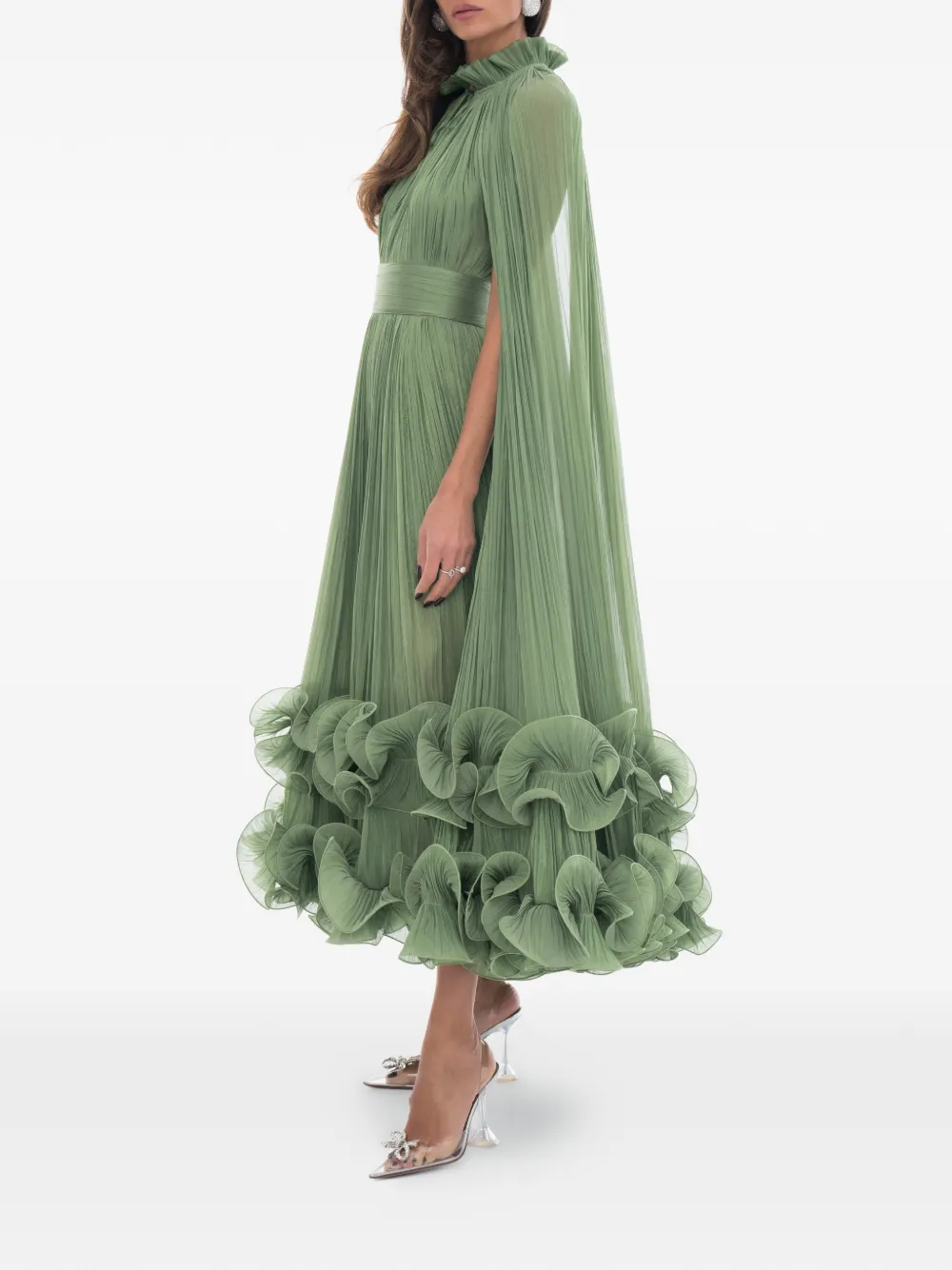 Зеленое платье со складками, оборчатым подолом, высоким воротом, завязками сзади, съемной накидкой, средней длины