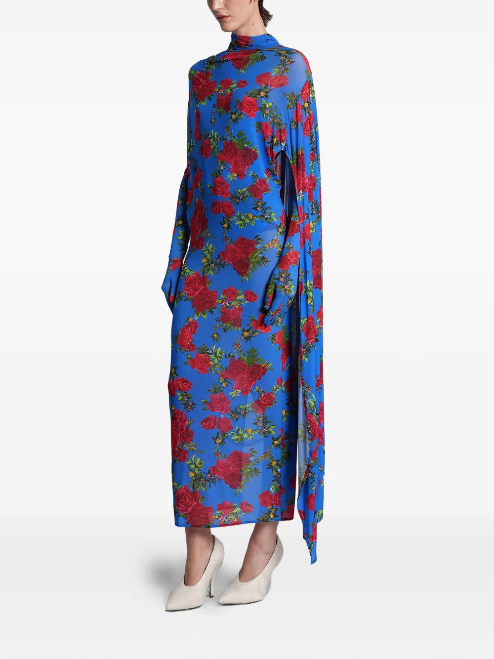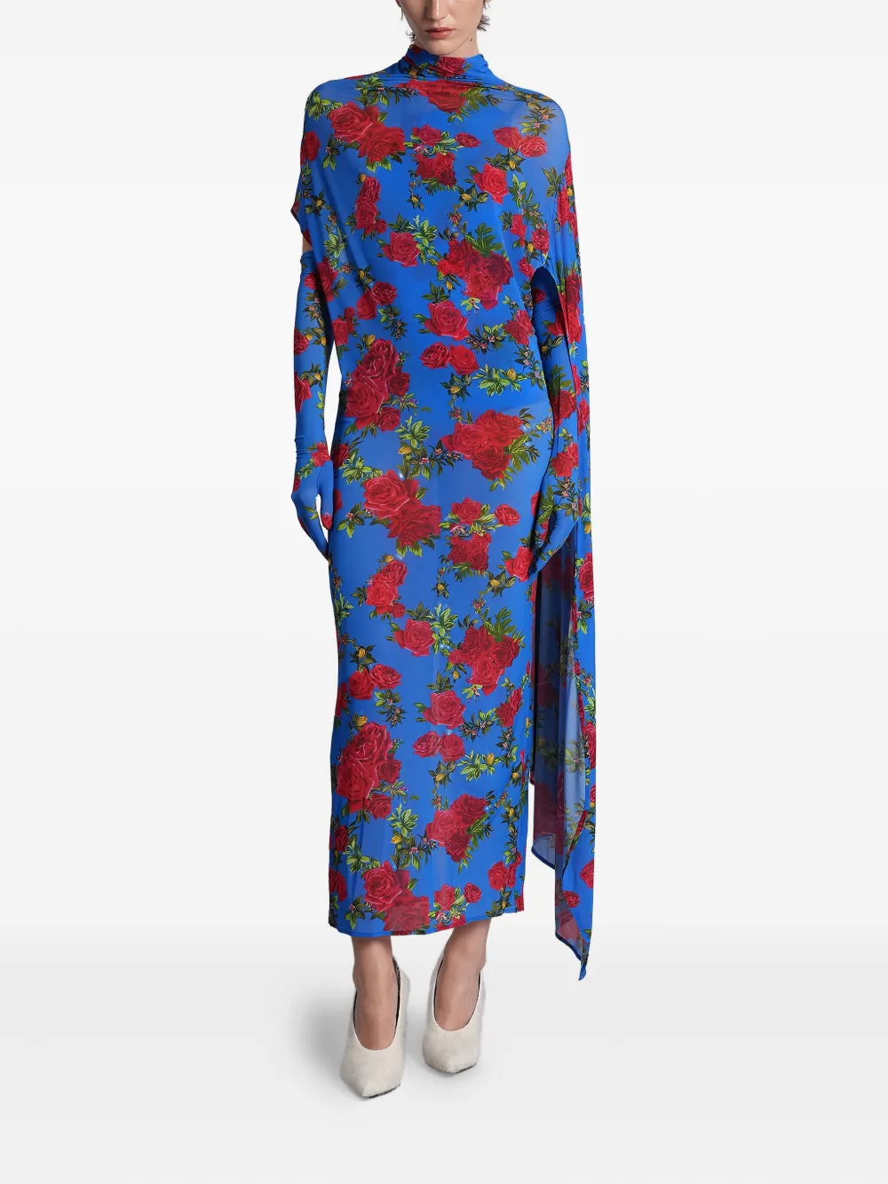 Голубое платье с цветочным принтом, высоким воротом, драпировкой, короткими рукавами и разрезом