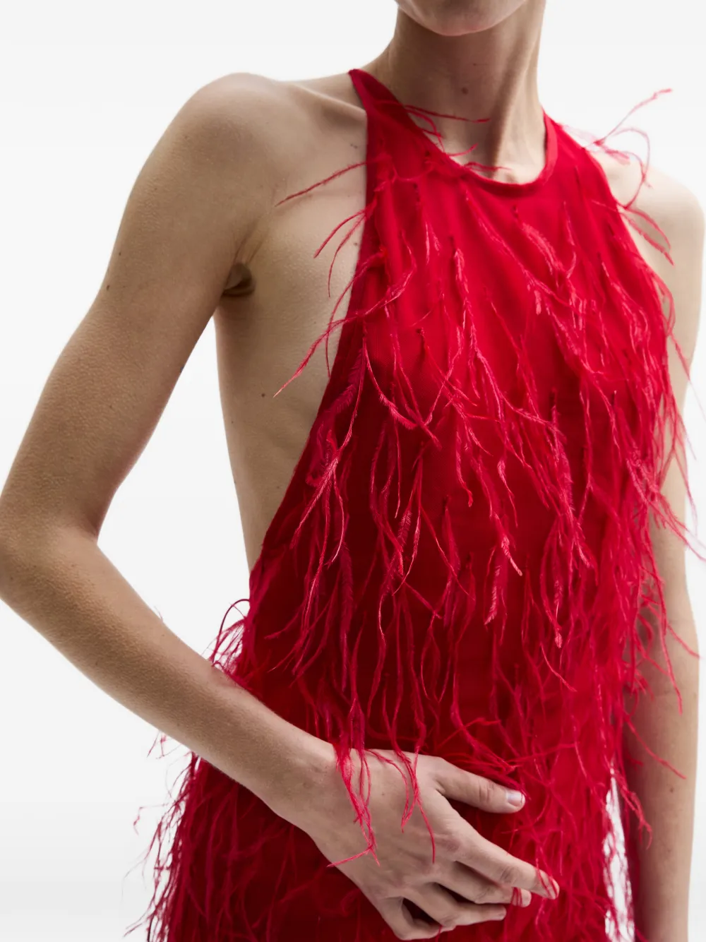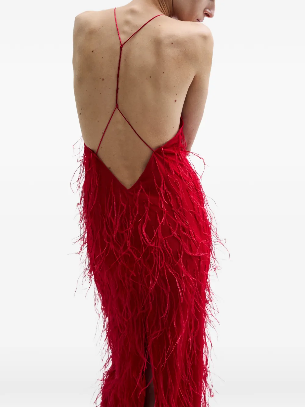 Красное украшение из перьев, халтер с открытой спиной, тонкие бретели, длина в пол