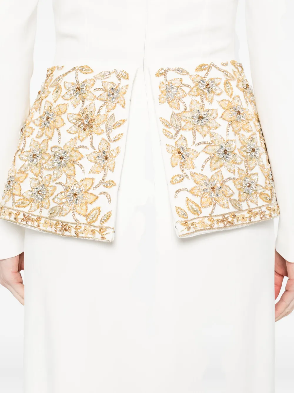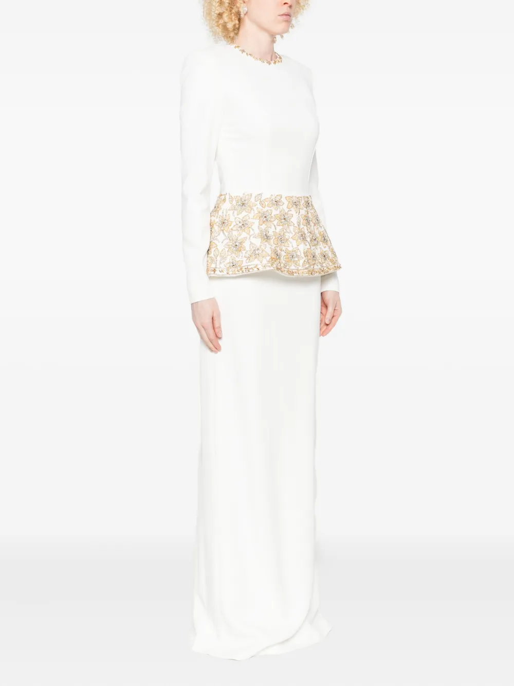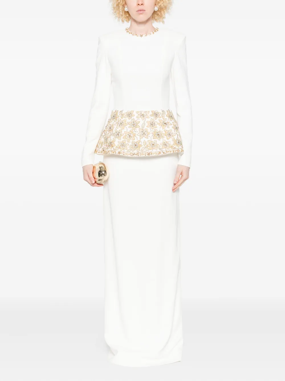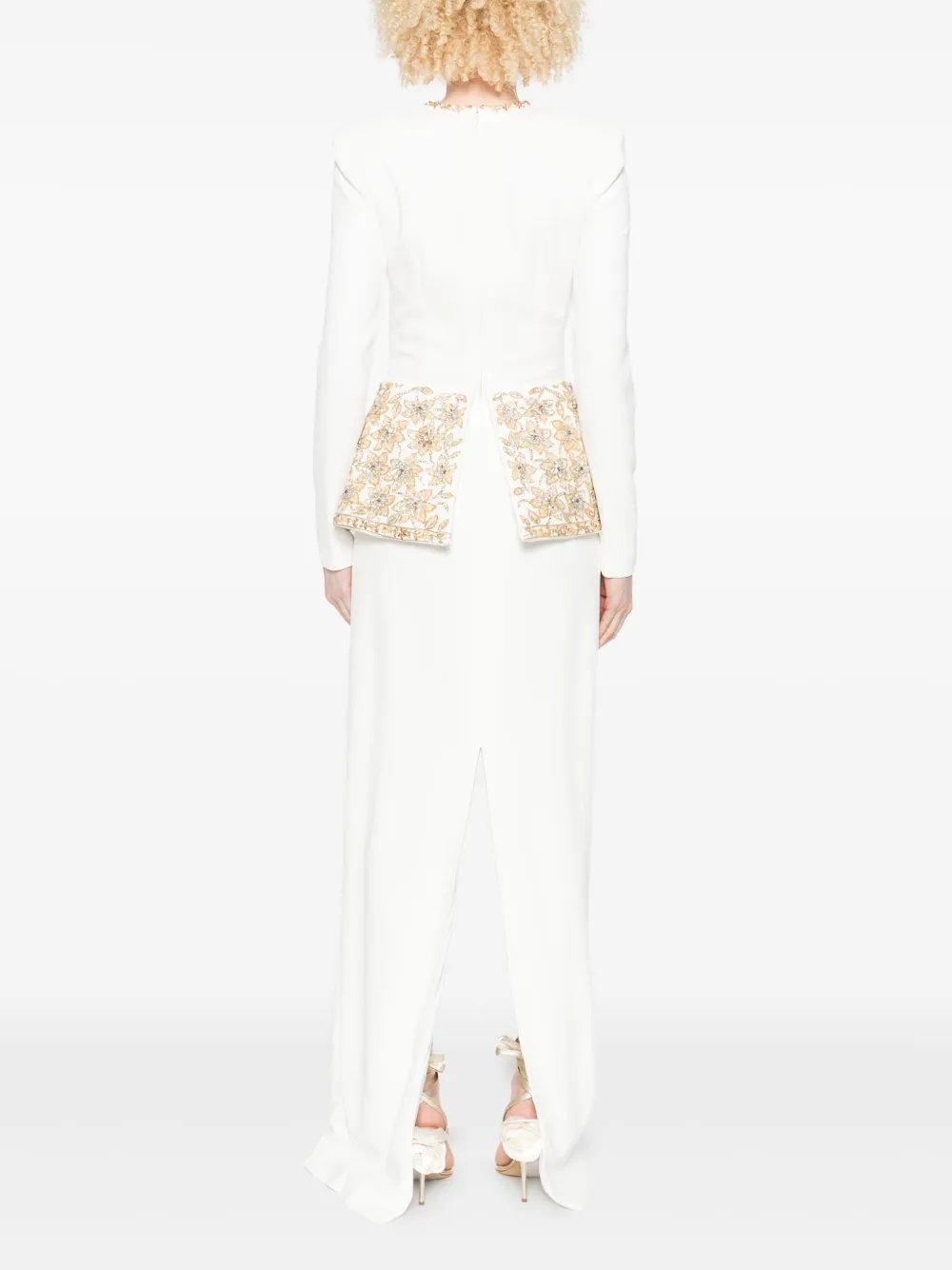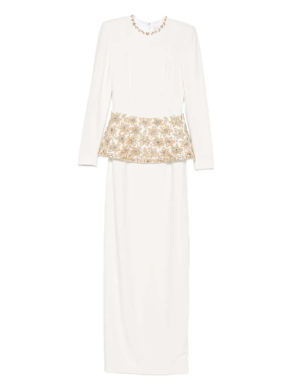 Белое платье с золотистой вышивкой, баской, длинными рукавами, круглым вырезом и украшенным воротником