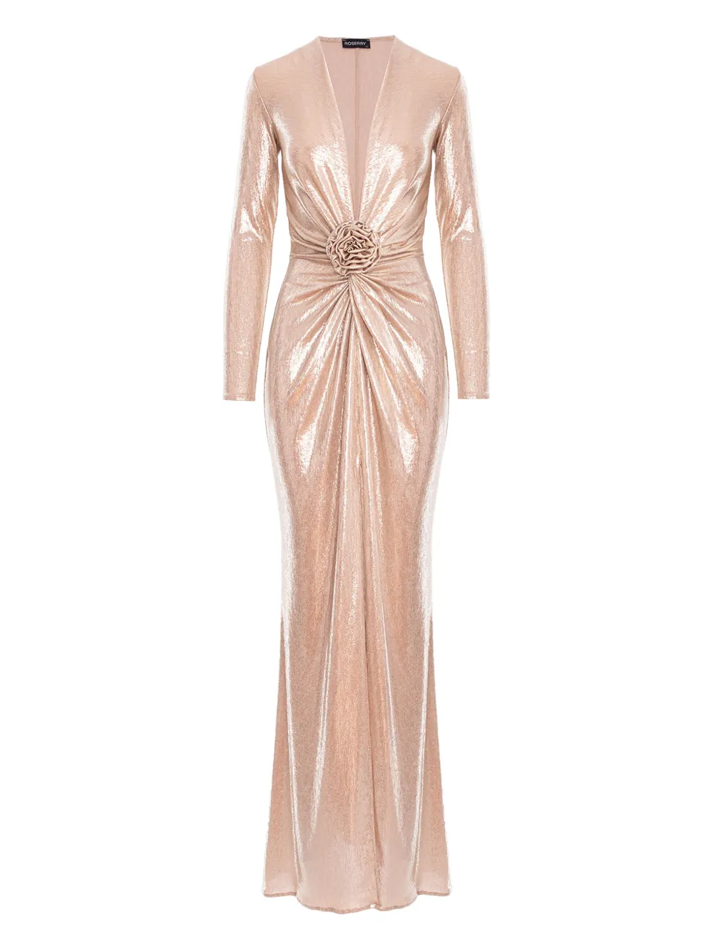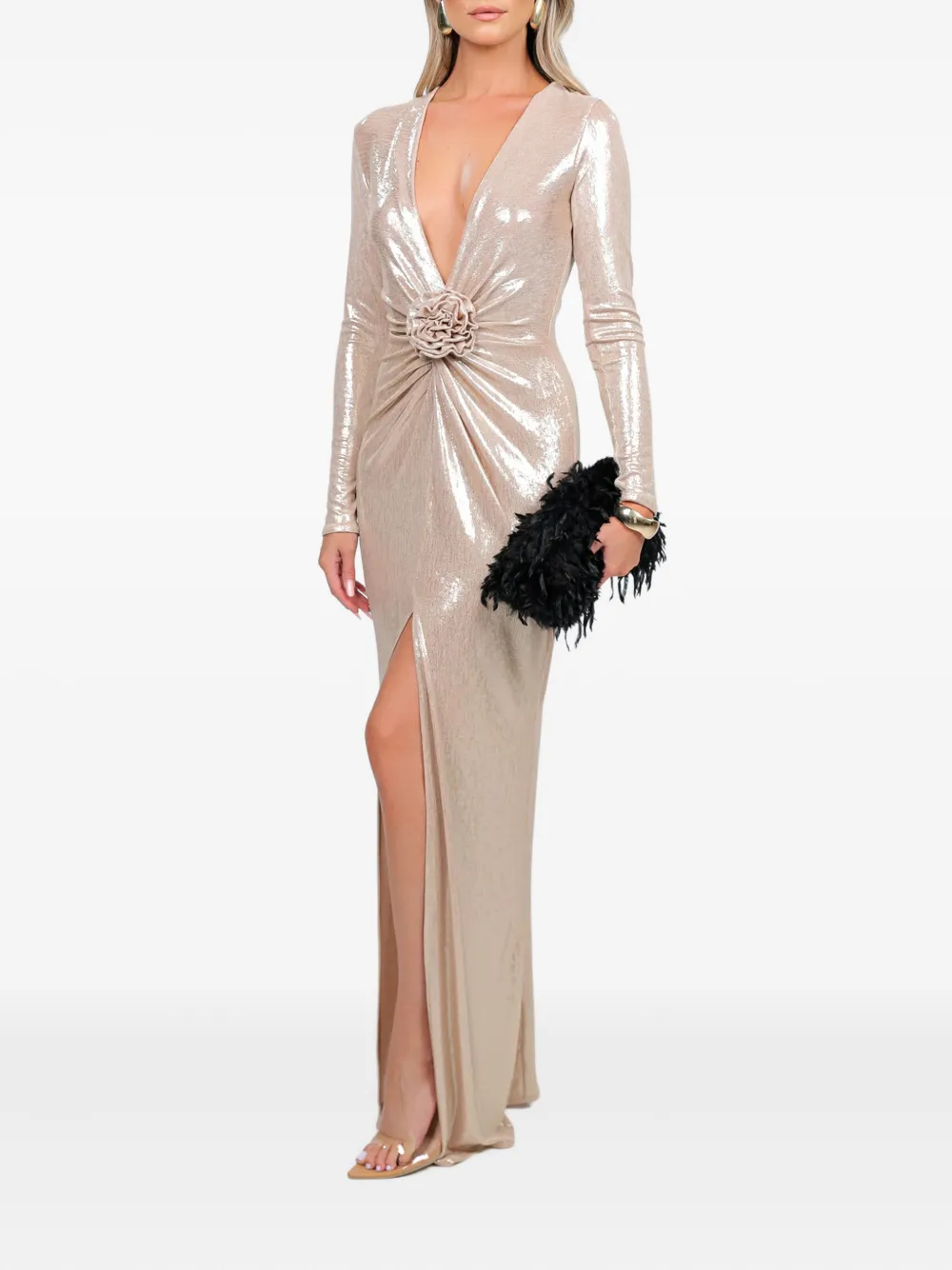 Золотистый цвет, цветочный декор, длинные рукава, V-образный вырез, разрез спереди