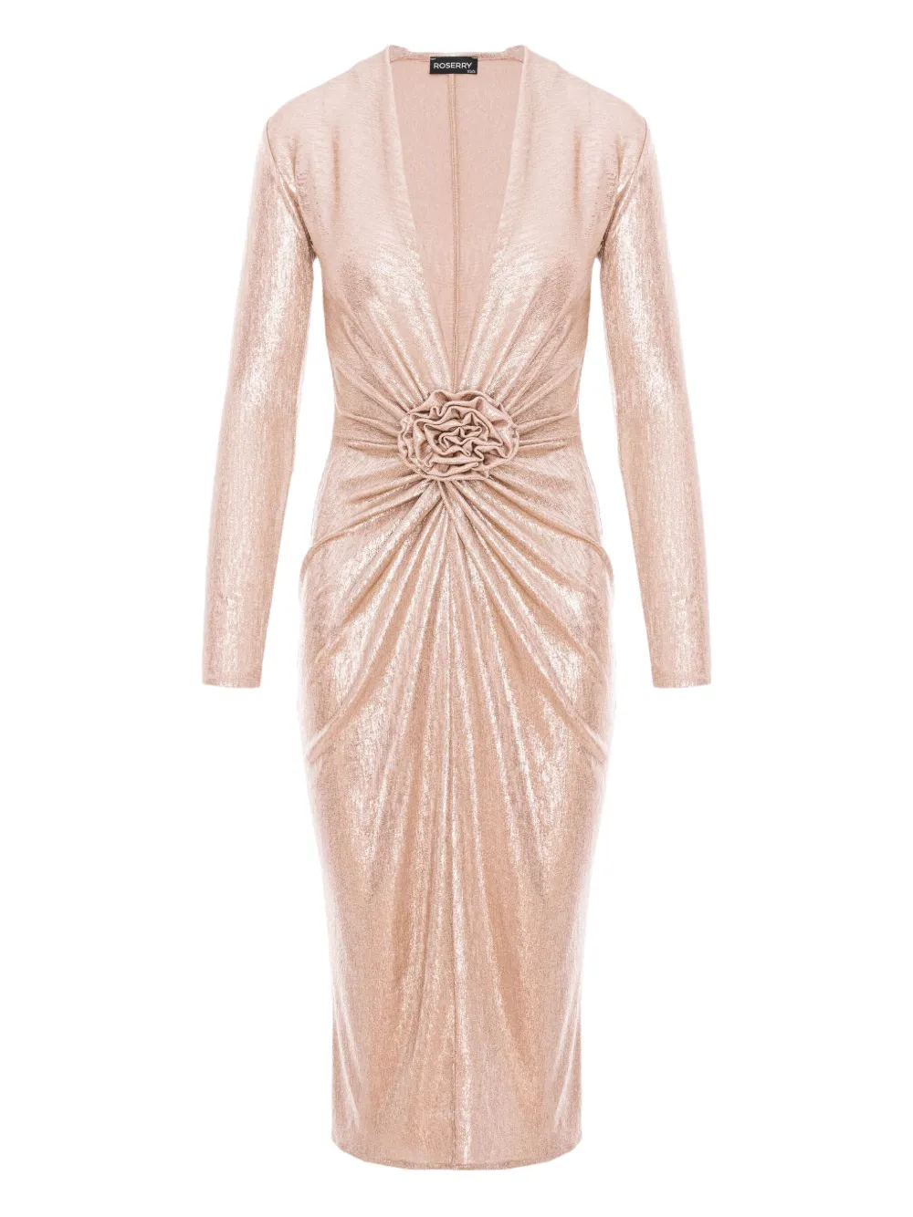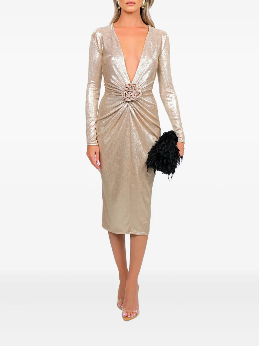 Золотистый цвет, V-образный вырез, длинные рукава, цветочный декор, присборенные детали, длина миди