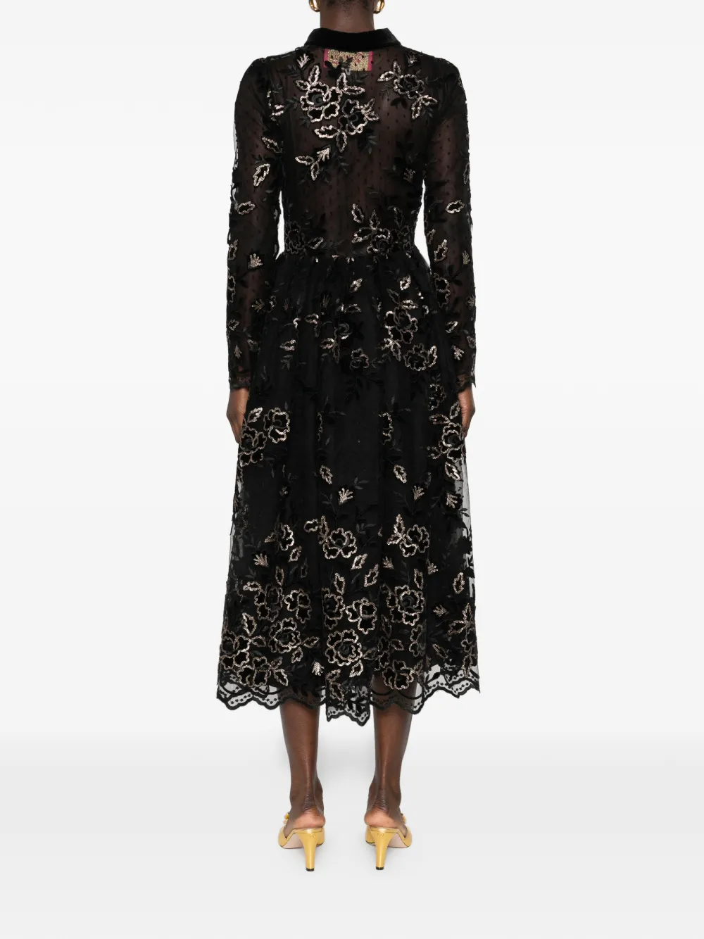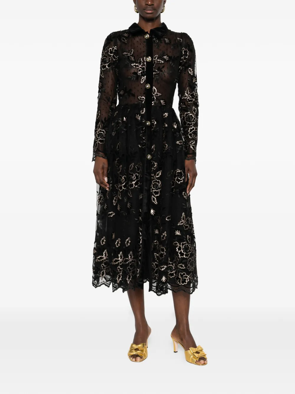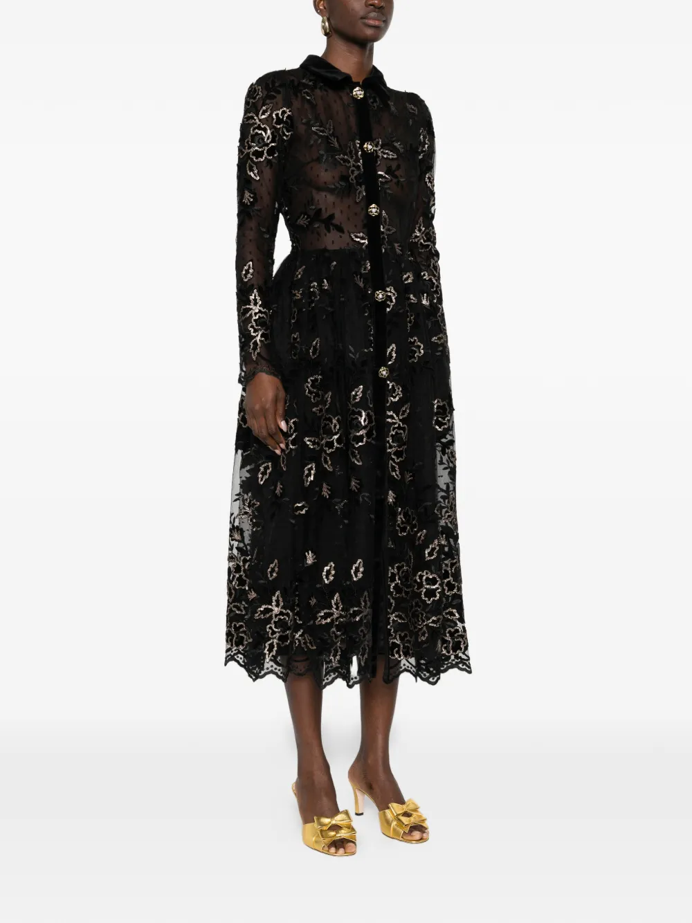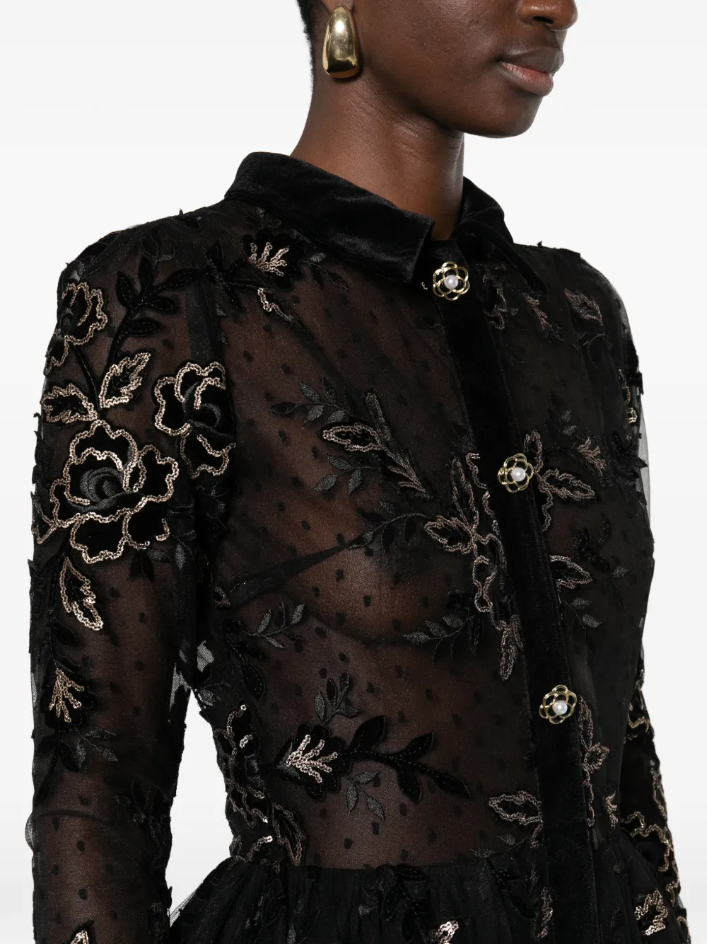 Черная рубашка с цветочной вышивкой, застежкой на пуговицы, бархатным воротником, волнистым подолом и съемным поясом на талии
