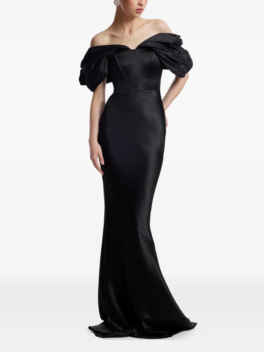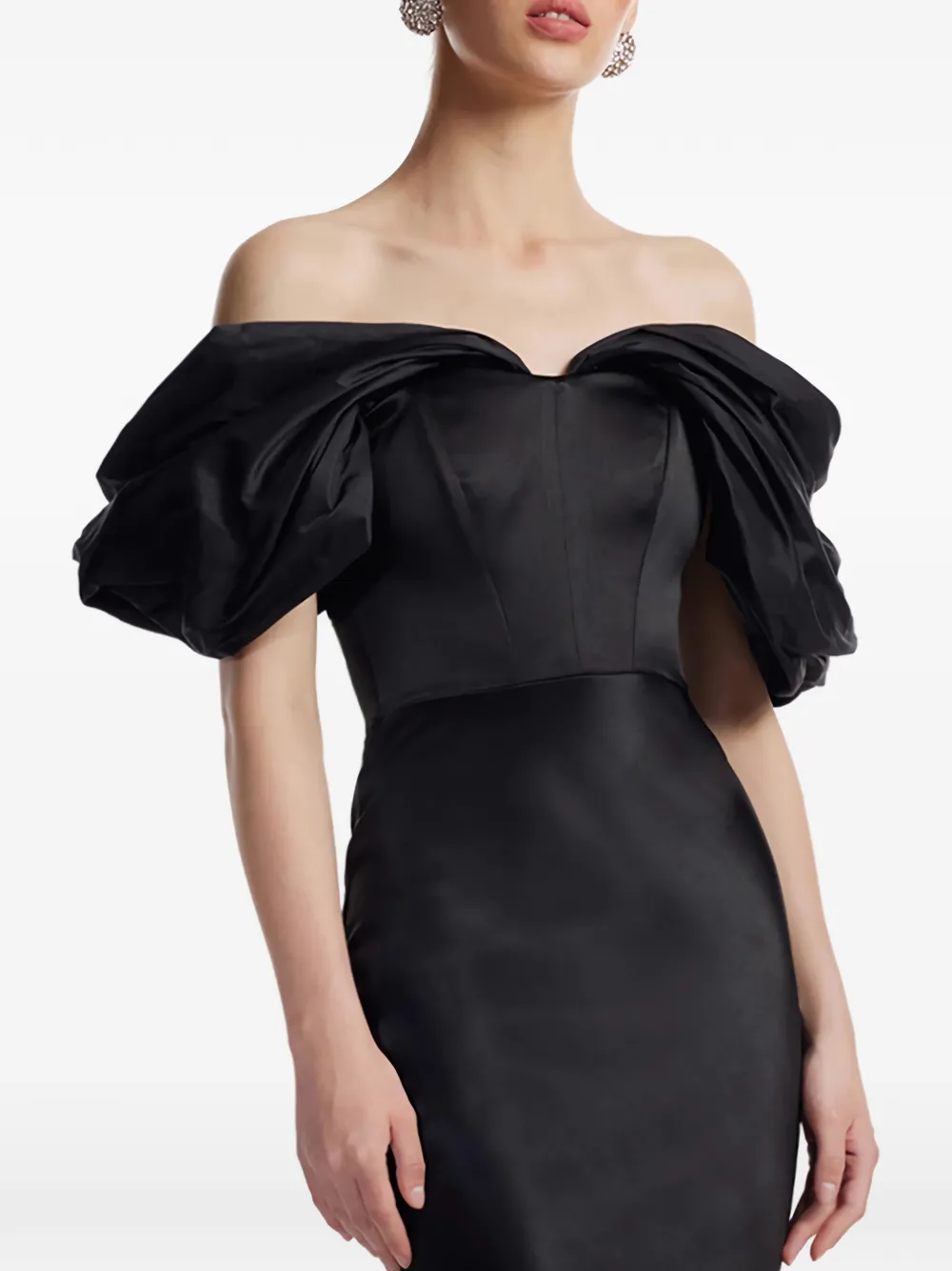 Черное платье с открытыми плечами, без бретелек, застежкой-молнией, подолом-«русалка», приталенным силуэтом