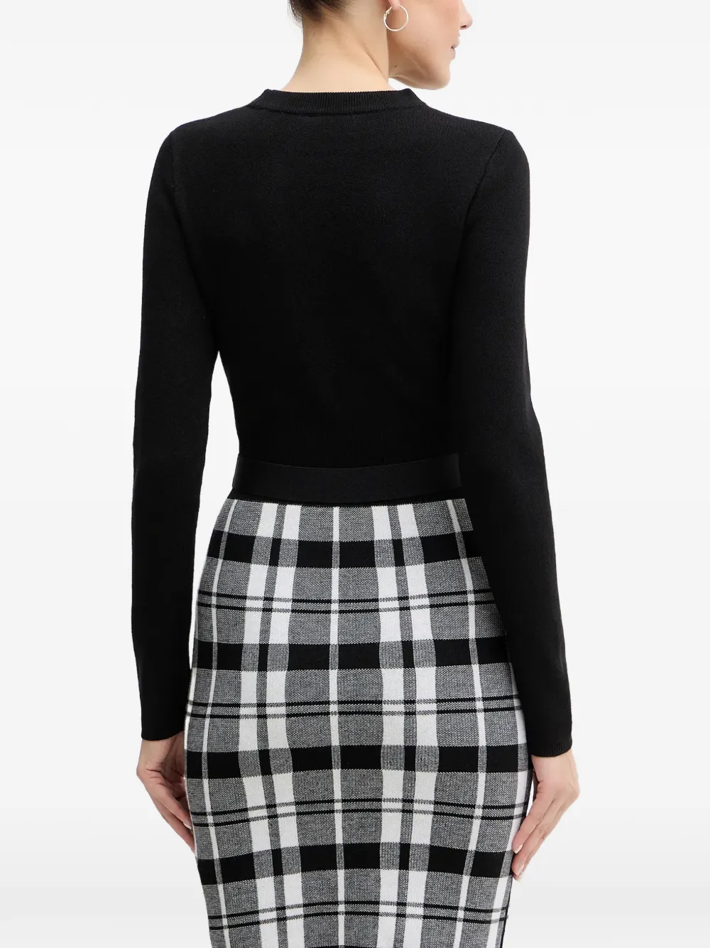 Черное платье в клетку с вырезами, длинными рукавами, круглым вырезом и поясом