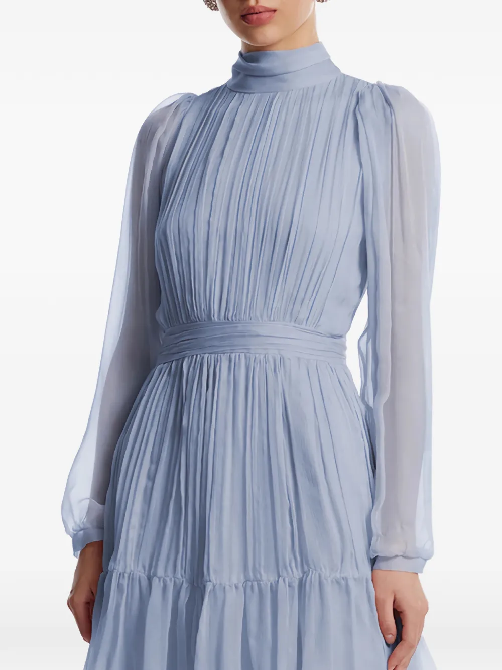 Синее платье с открытой спиной, завязками, длинными рукавами и плиссированной юбкой
