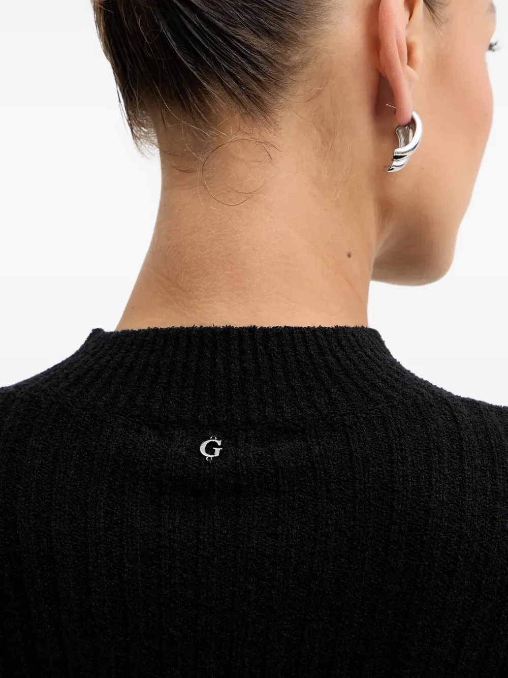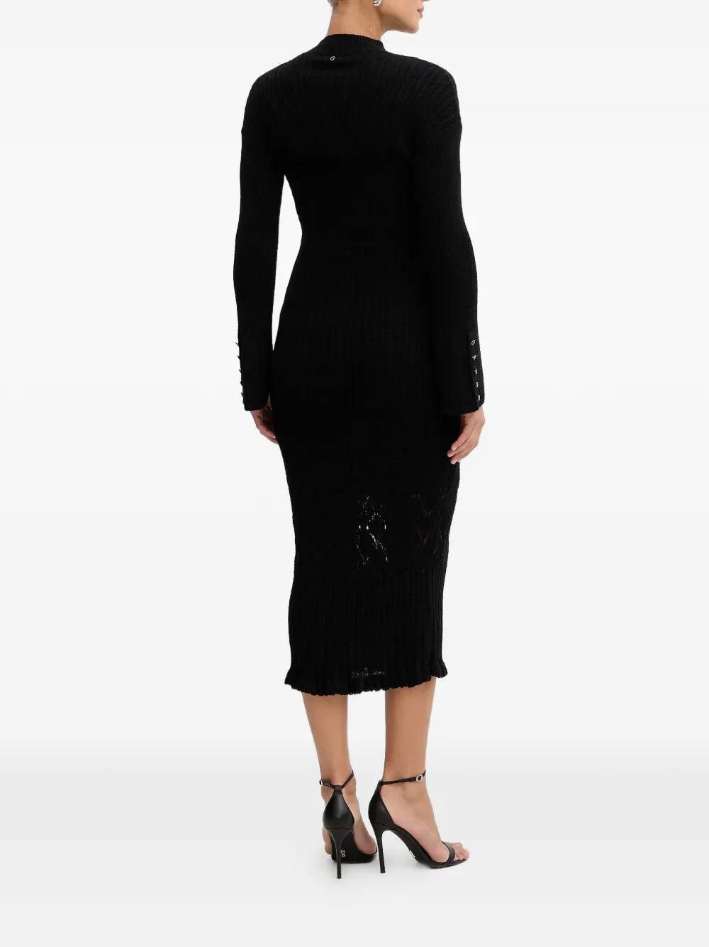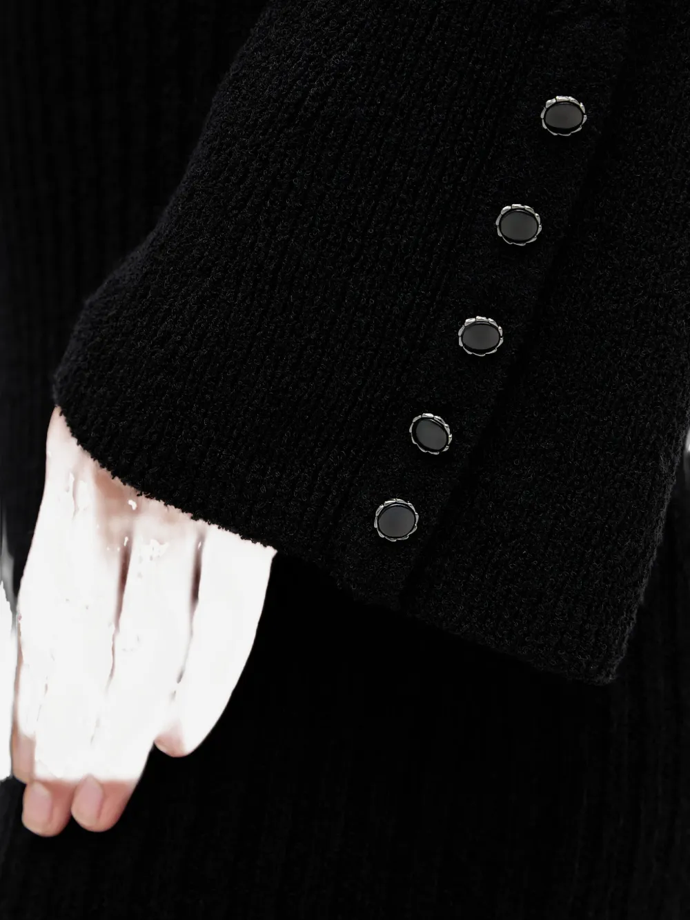 Черный вязаный материал, застежки на пуговицы на манжетах, круглый вырез, вырезная деталь, логотип на спине