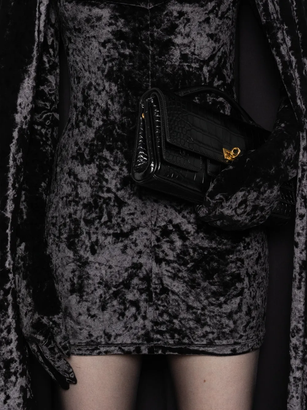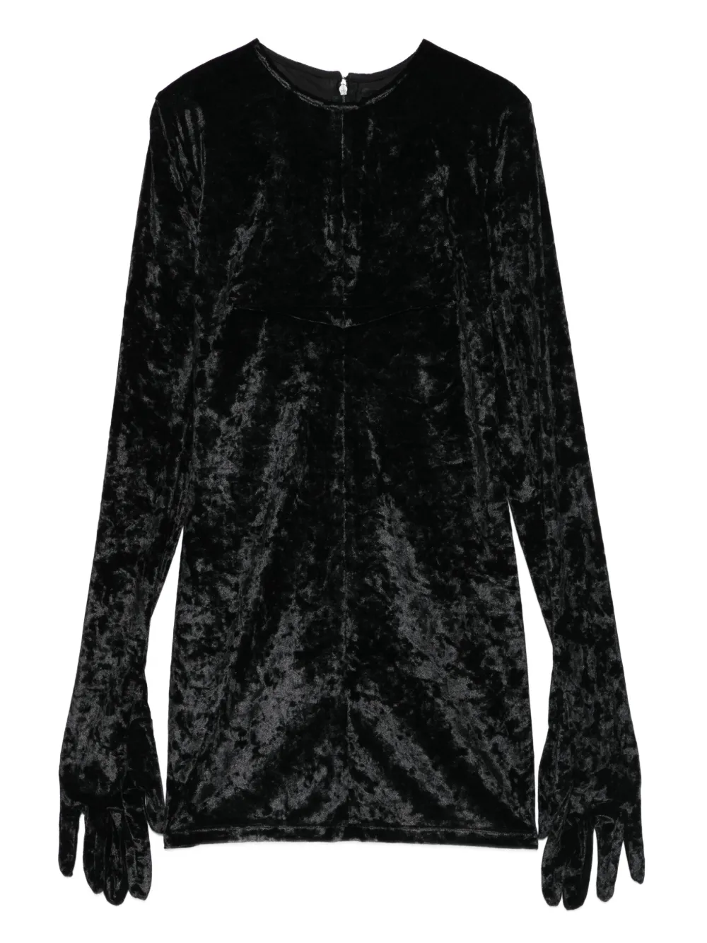 Черная бархатная фактура, длинные рукава, встроенные перчатки, круглый вырез, скрытая застежка-молния
