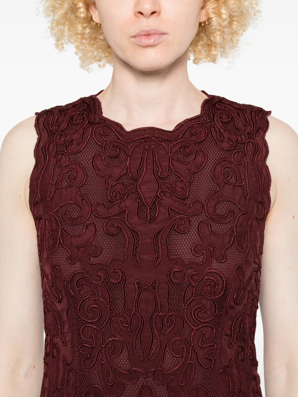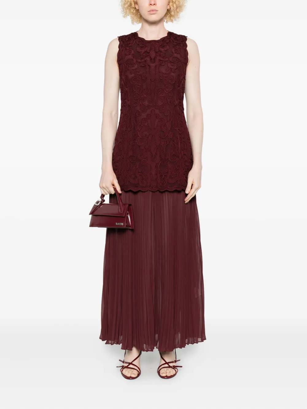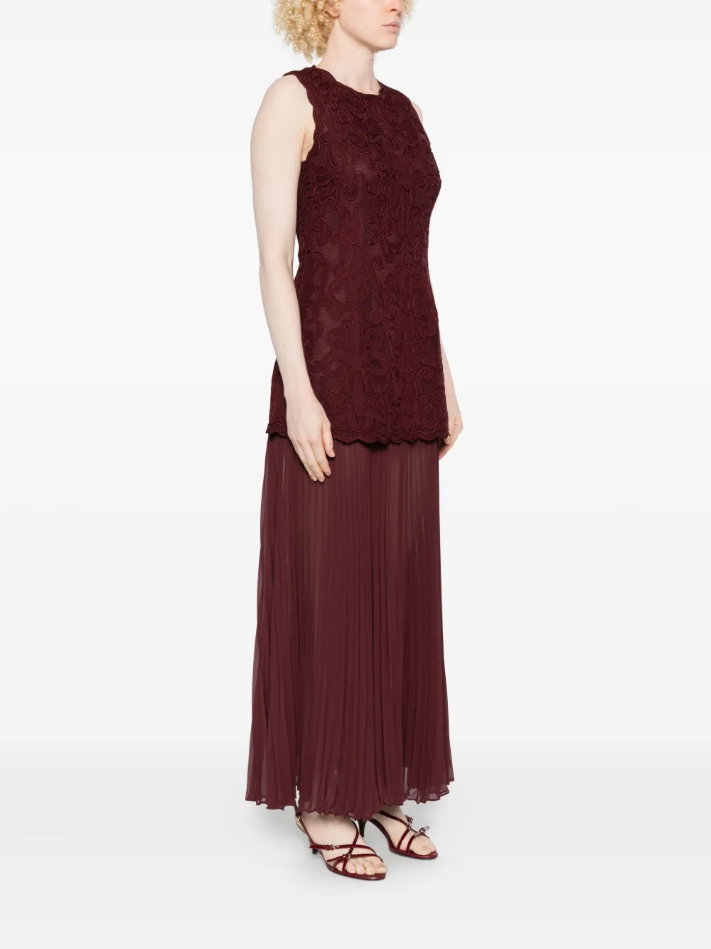 Бордовый лиф из макраме без рукавов плиссированная юбка круглый вырез зубчатый край