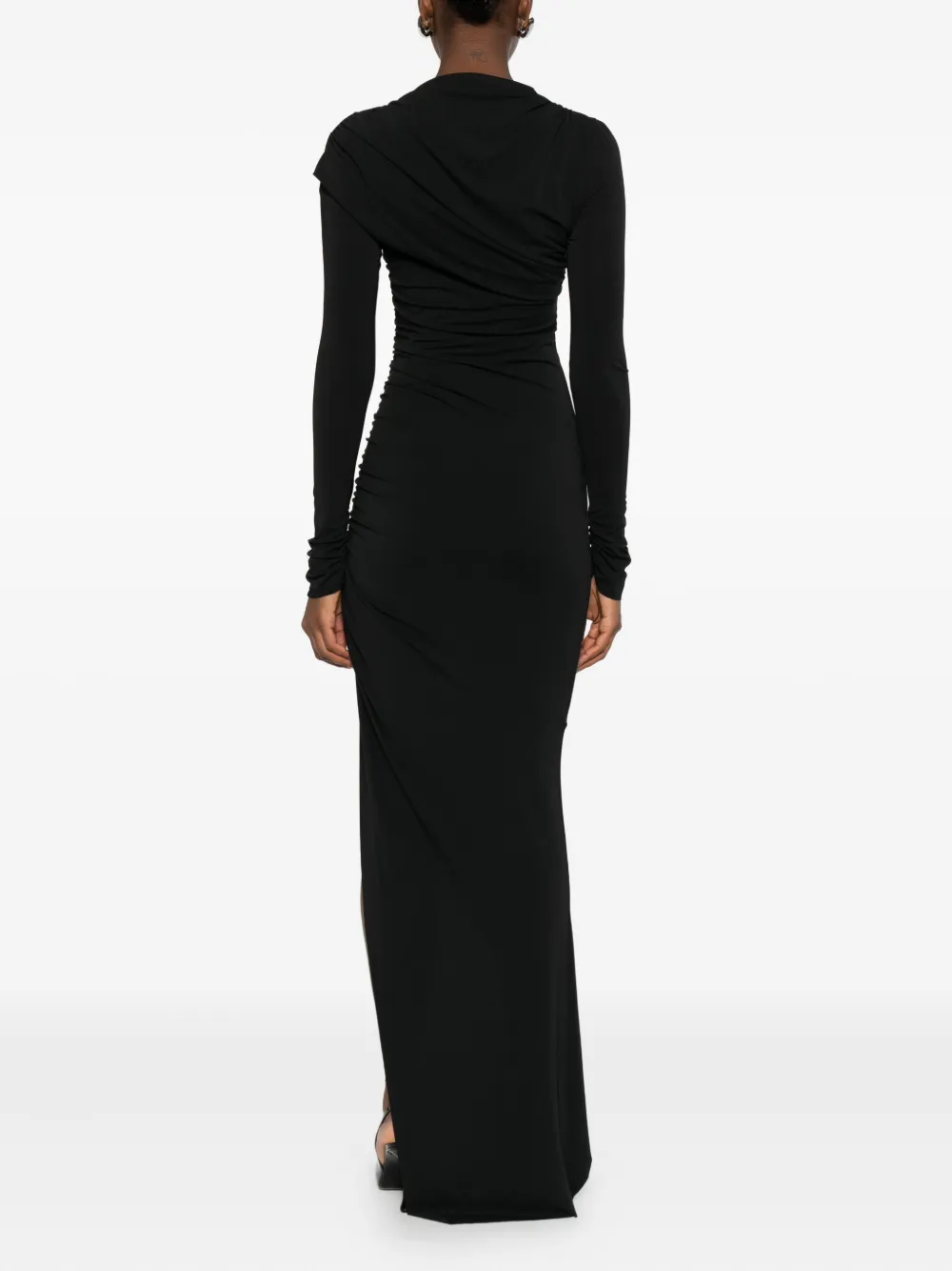 Черный асимметричный вырез длинные рукава драпированный лиф разрез сбоку