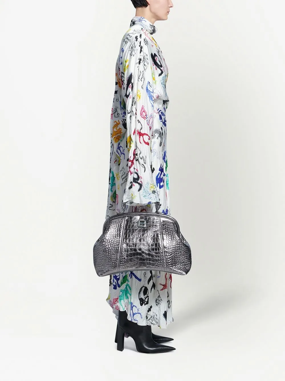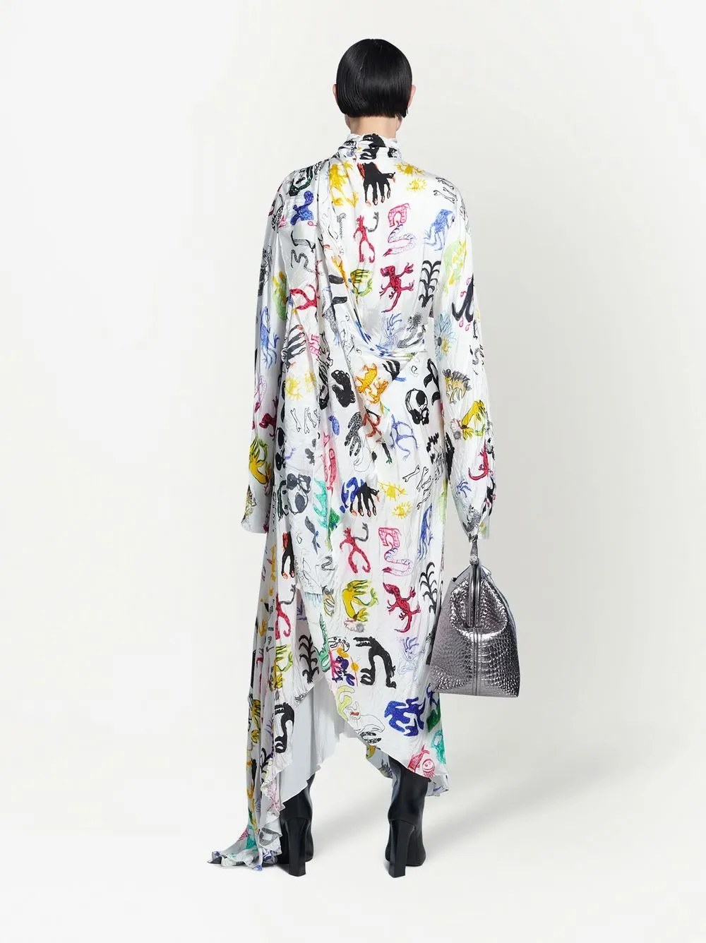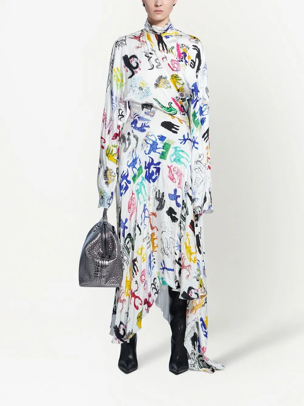 • Белый/разноцветный, сплошной графичный принт, высокий воротник, перекрученная деталь, длинные рукава, драпировка и асимметричная форма.