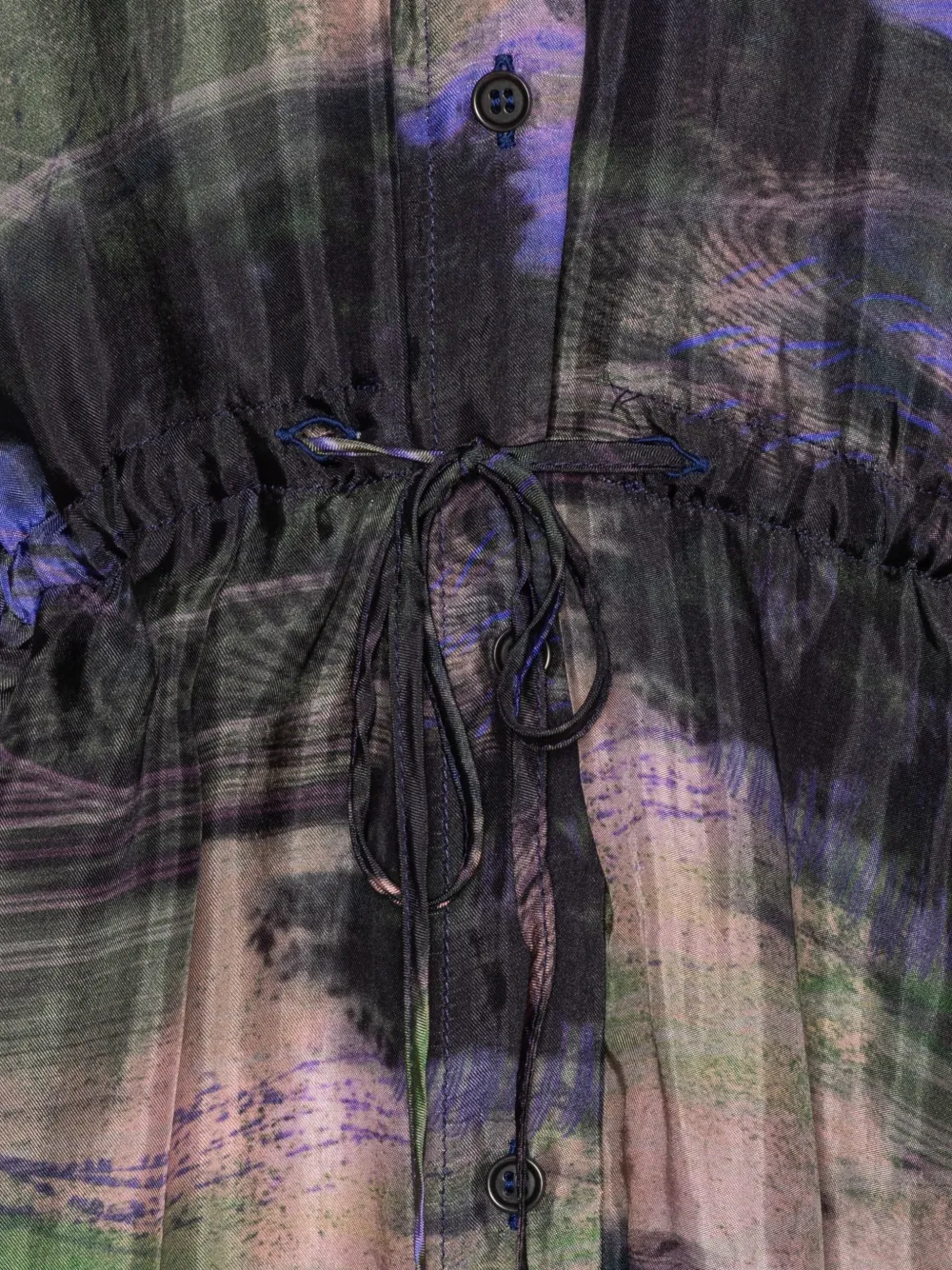 Черный, зеленый и разноцветный графический принт, талия на кулиске, застежка на пуговицы, длинные рукава