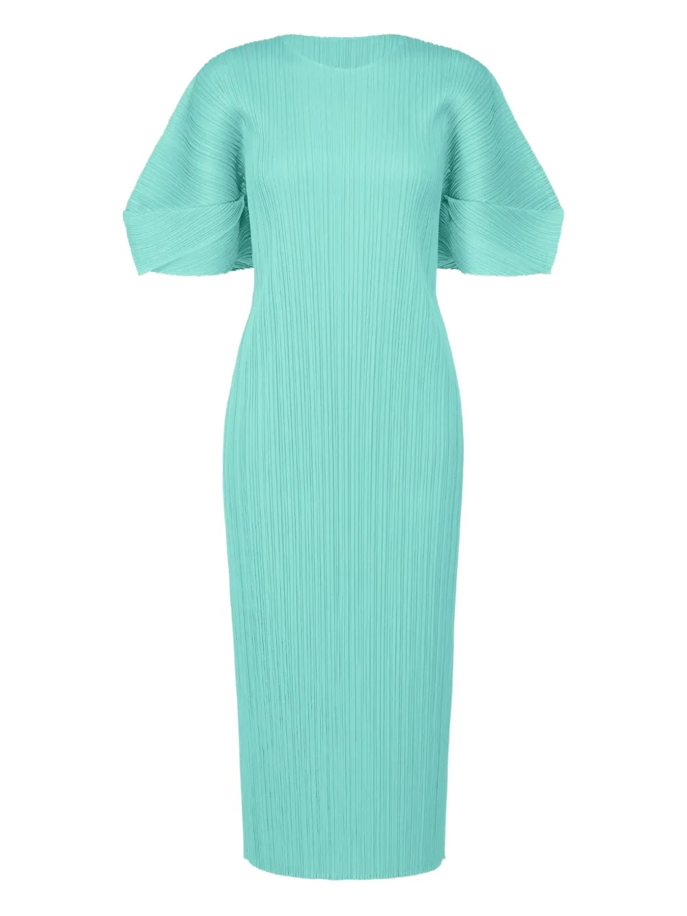 Это платье миди аква-голубого цвета с плиссировкой имеет круглый вырез горловины и характерные объемные рукава-долман средней длины с диагональной плиссировкой.