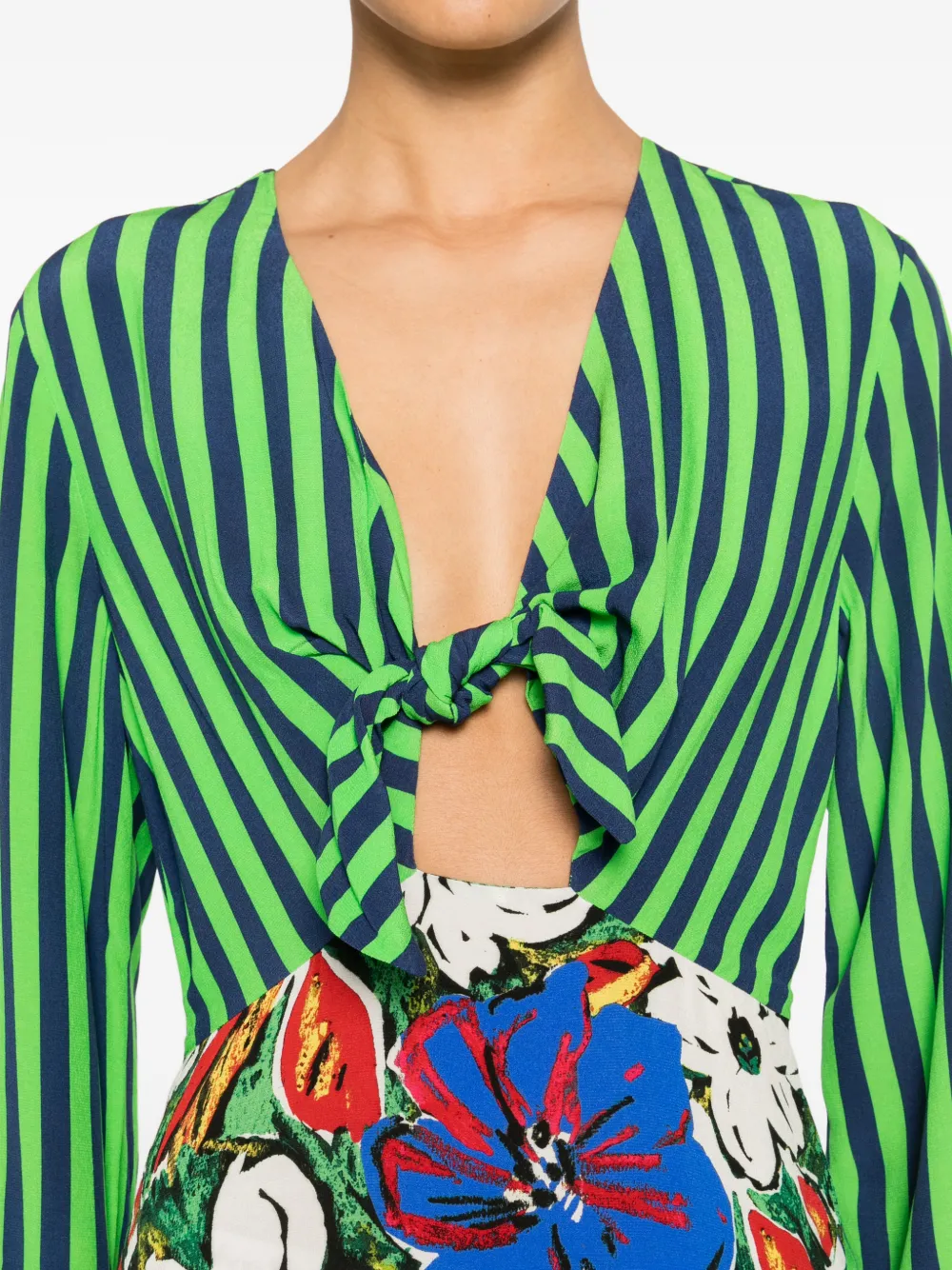 Зеленый и разноцветный полосатый принт, длинные рукава, деталь с узлом