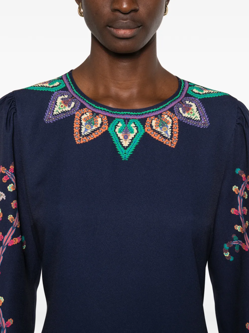 Темно-синяя с принтом "пейсли", отделка с узором, круглый вырез, длинные рукава, скрытая застежка-молния