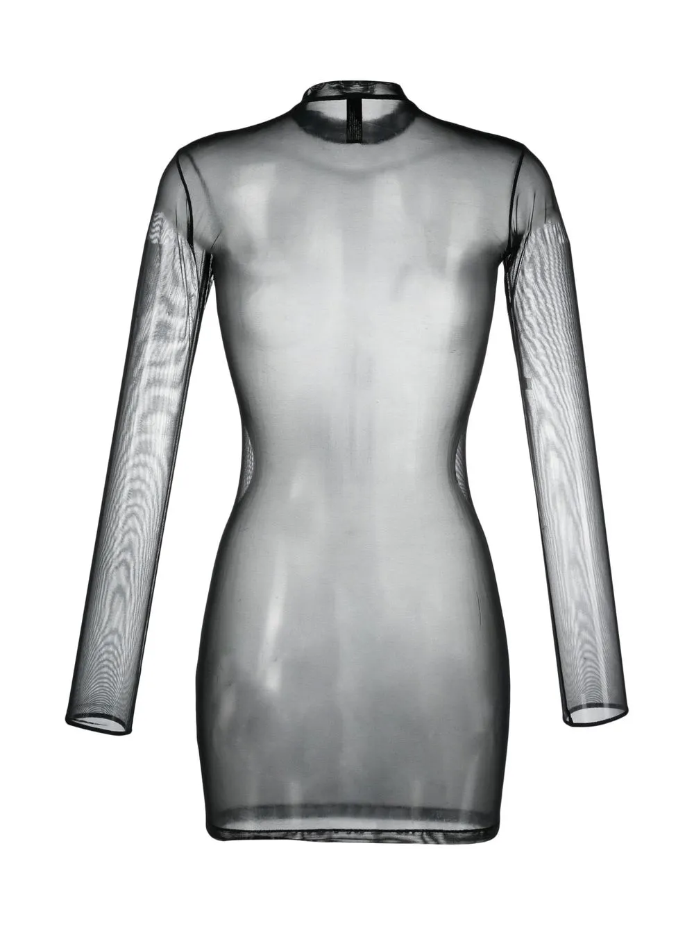 Черный, прозрачный материал, сетка, эластичный материал, высокий воротник, длинные рукава и длина до бедер.