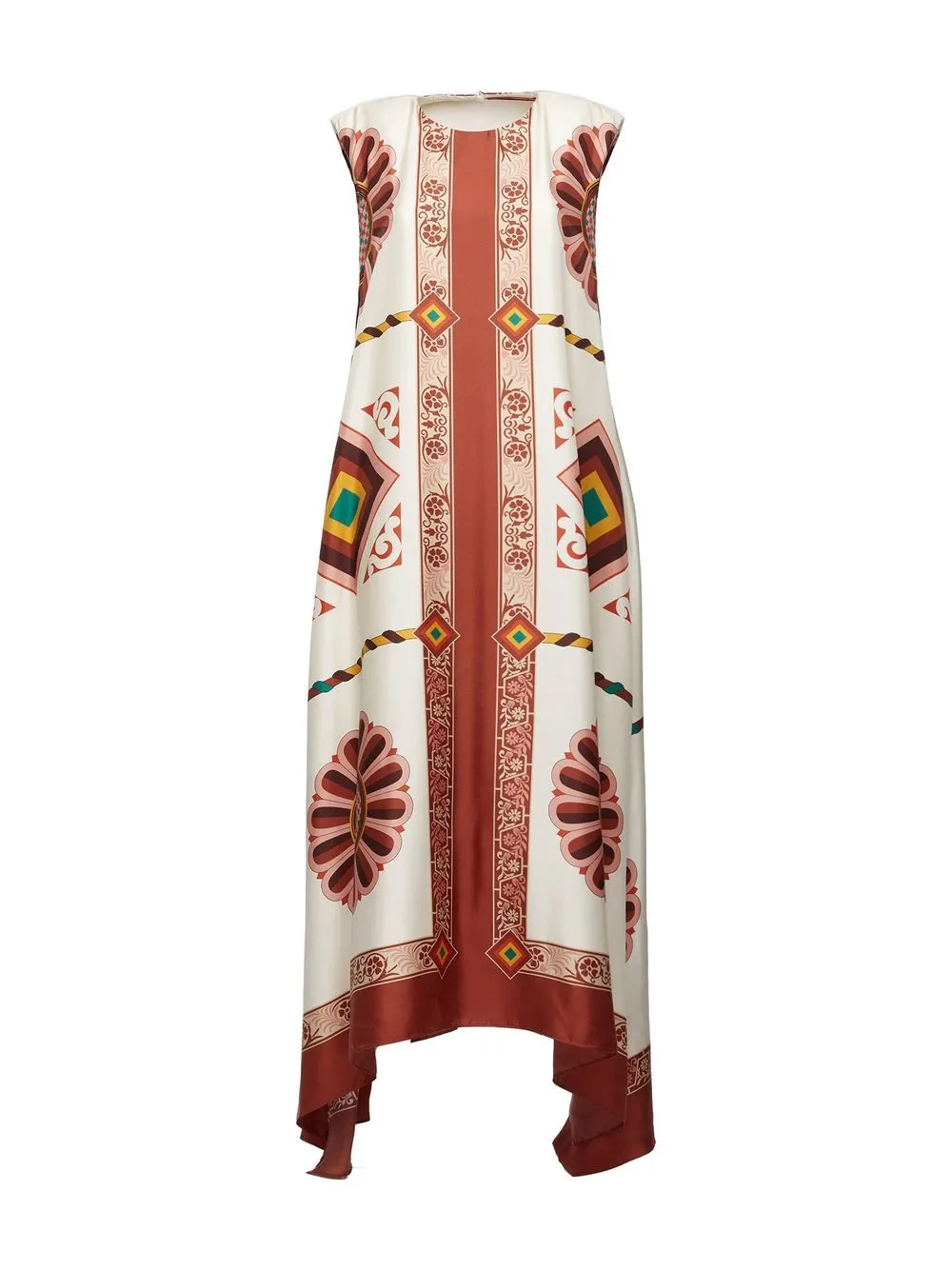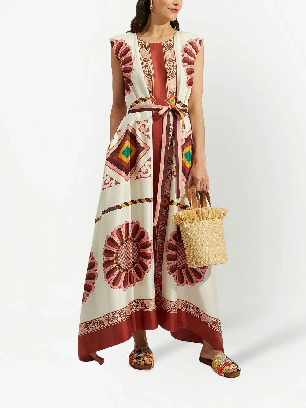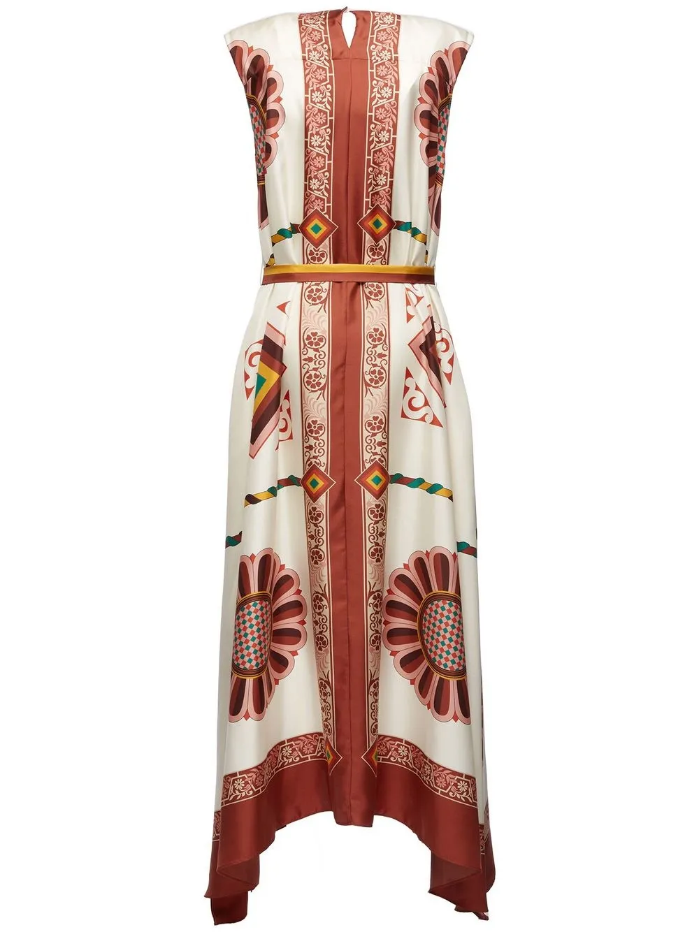 Белый, разноцветный, шелк, асимметричная форма, сплошной графичный принт, круглый вырез, ремень на талии и короткие рукава.