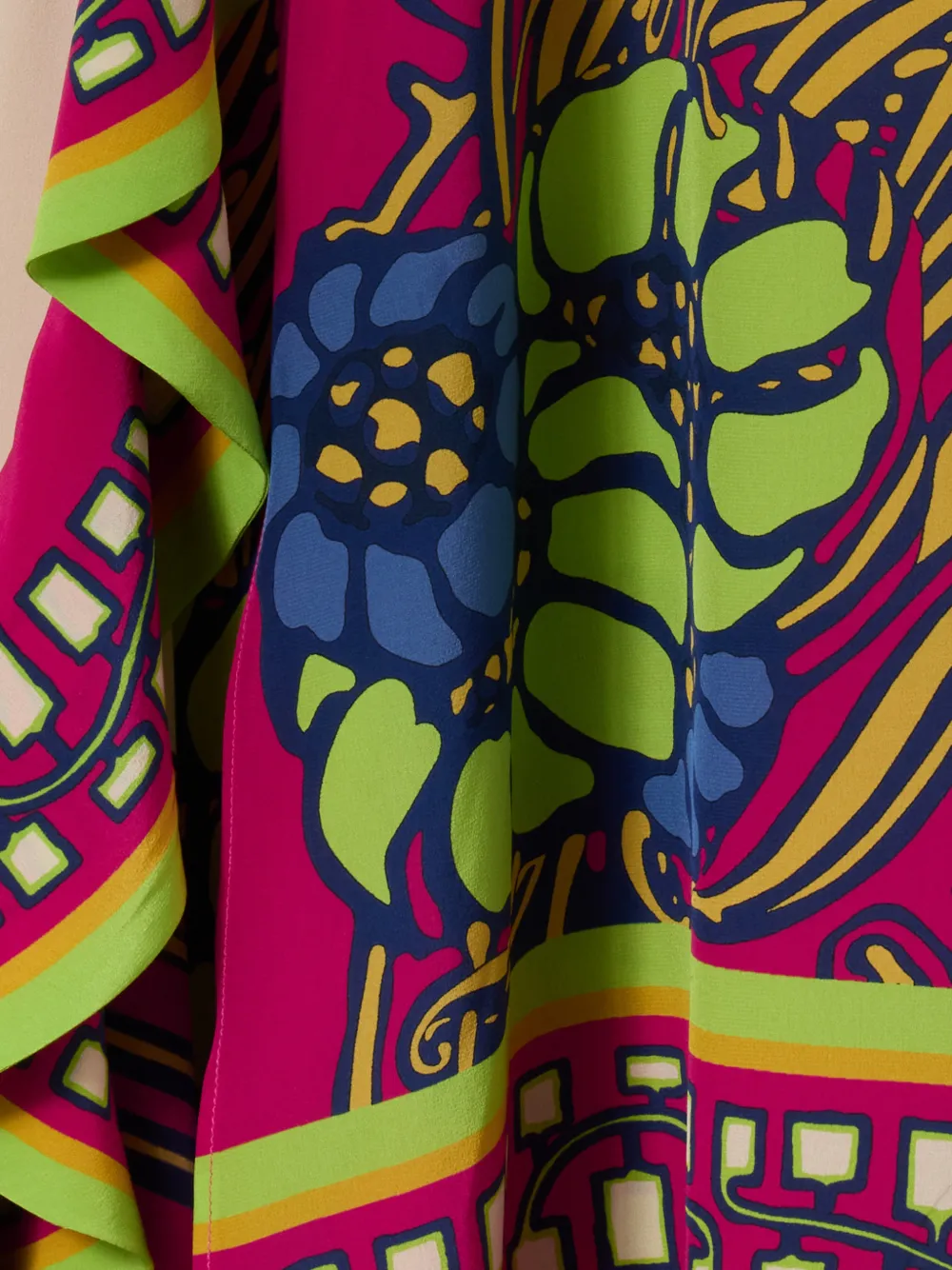 Бежевое шелковое платье с цветочным принтом, V-образным вырезом, оборками и тонкими бретелями