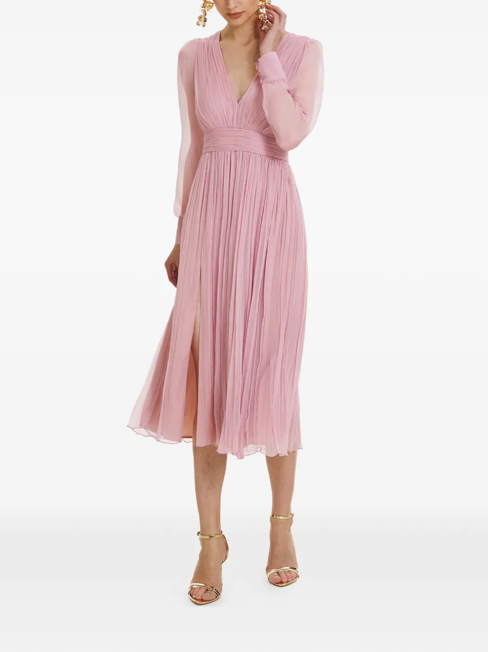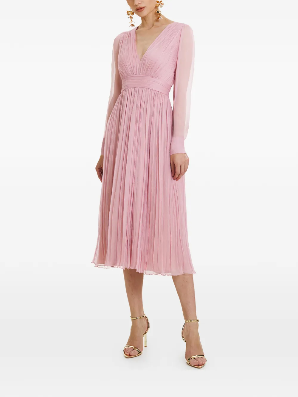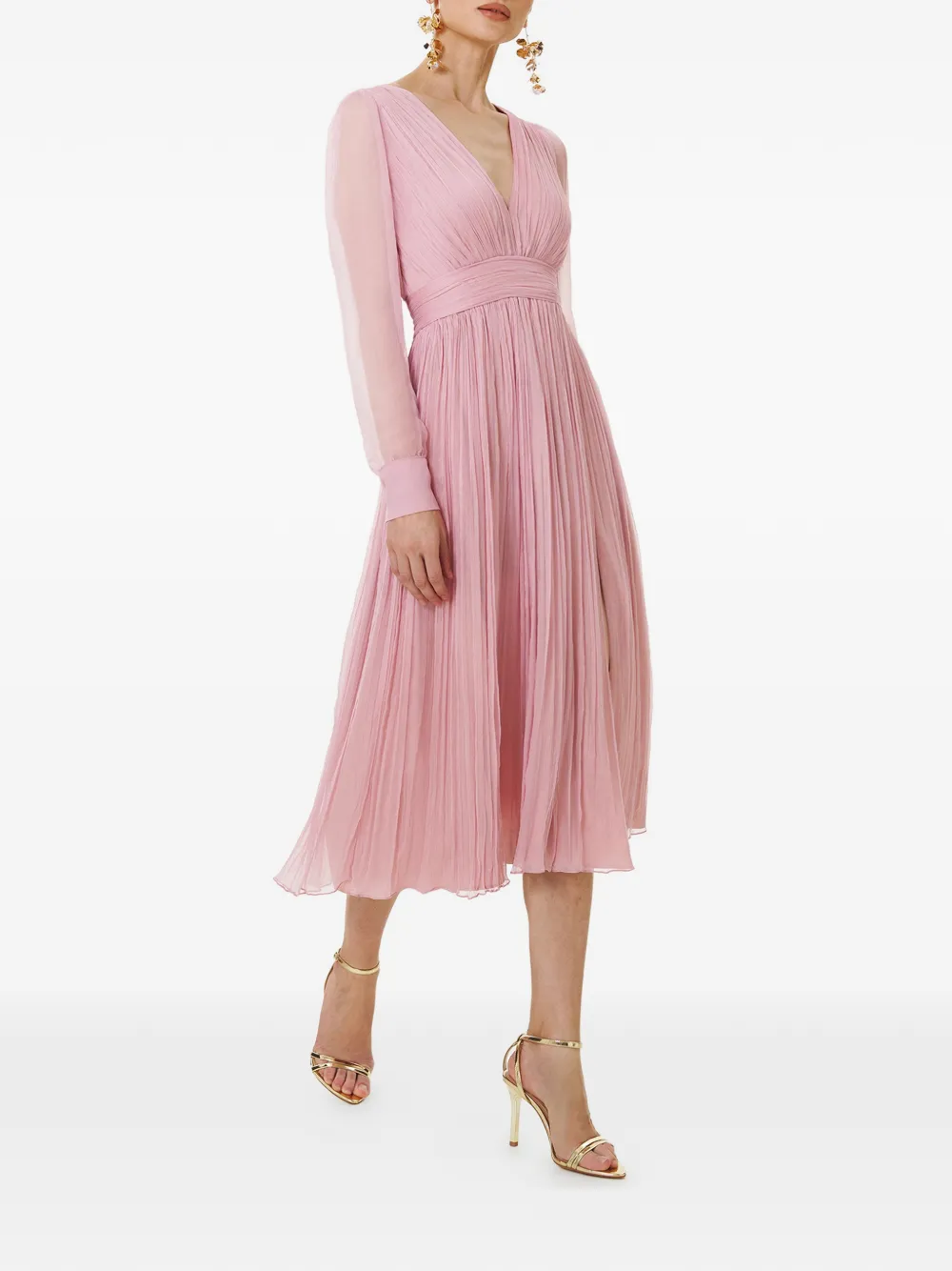 Розовая плиссированная блузка с V-образным вырезом и длинными рукавами