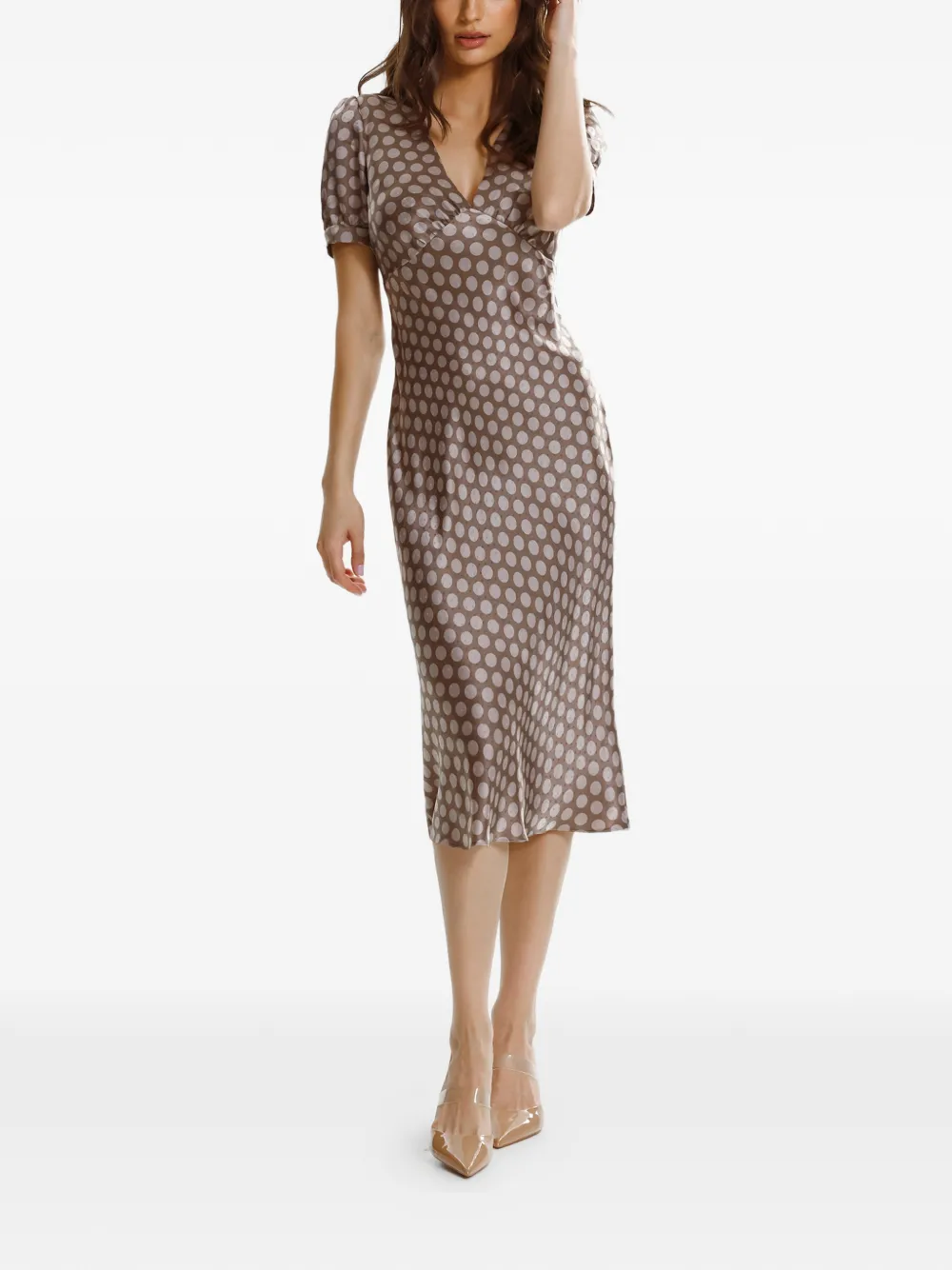 Коричневое и бежевое платье в горошек, V-образный вырез, короткие рукава, сборка на груди, длина миди