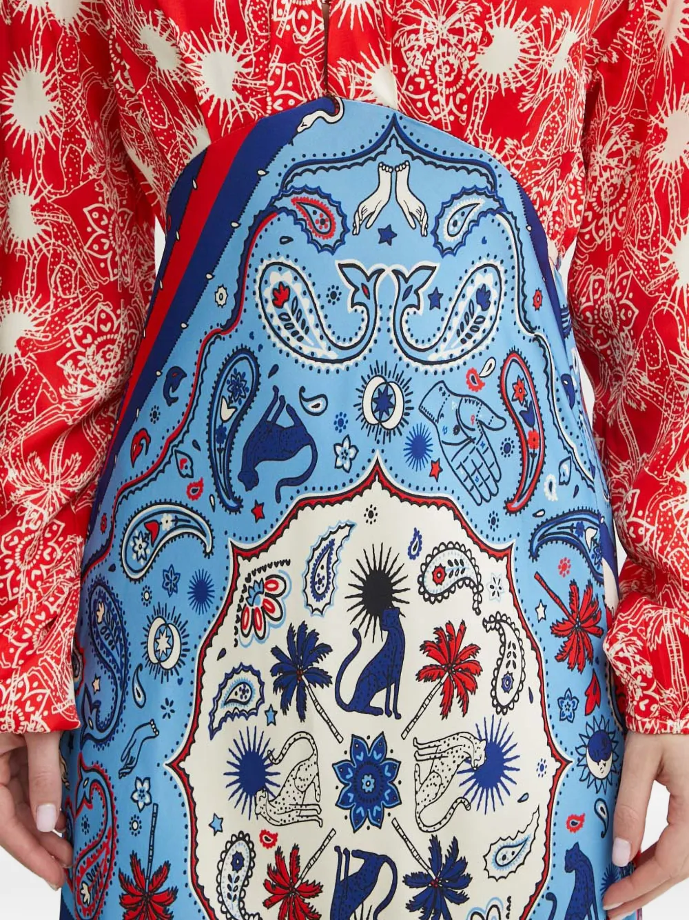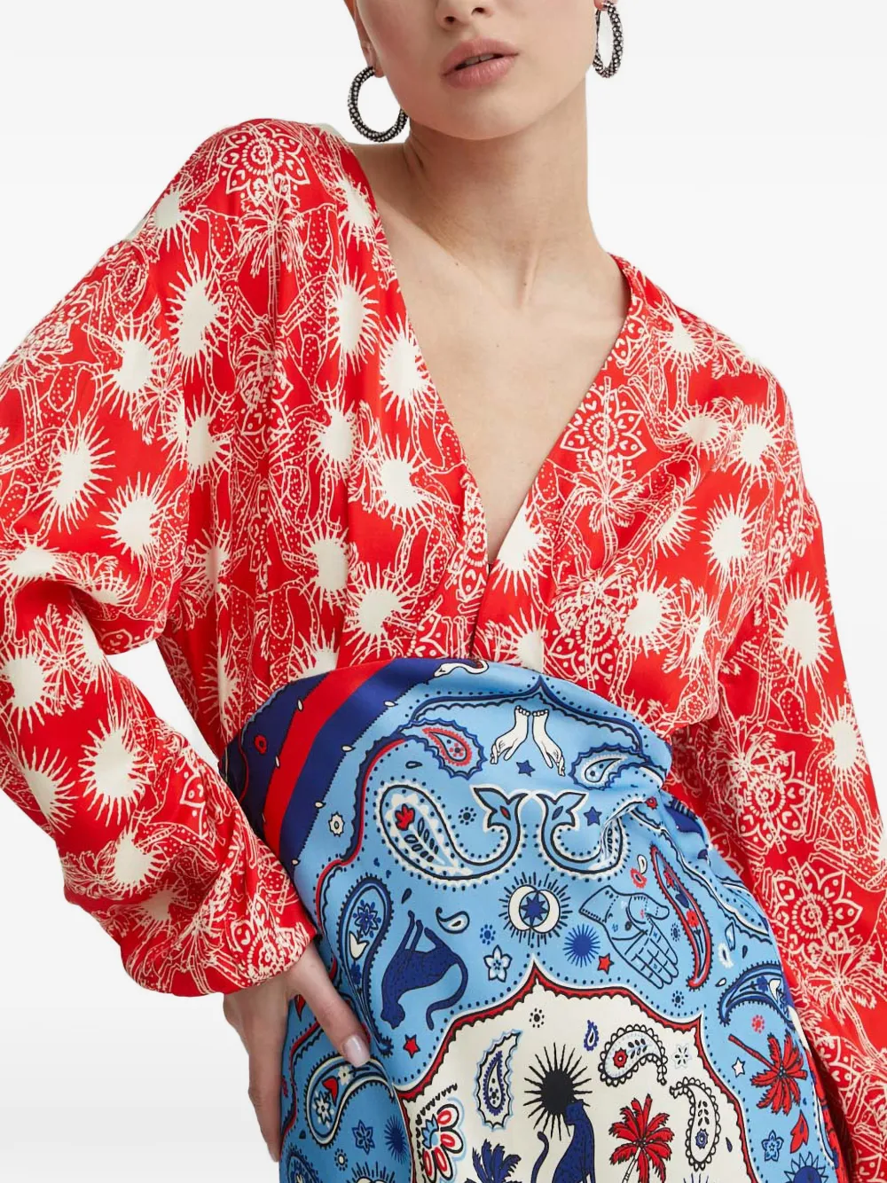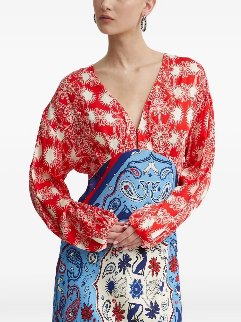 Макси-платье с длинными рукавами, V-образным вырезом, разноцветным принтом и оборками на манжетах