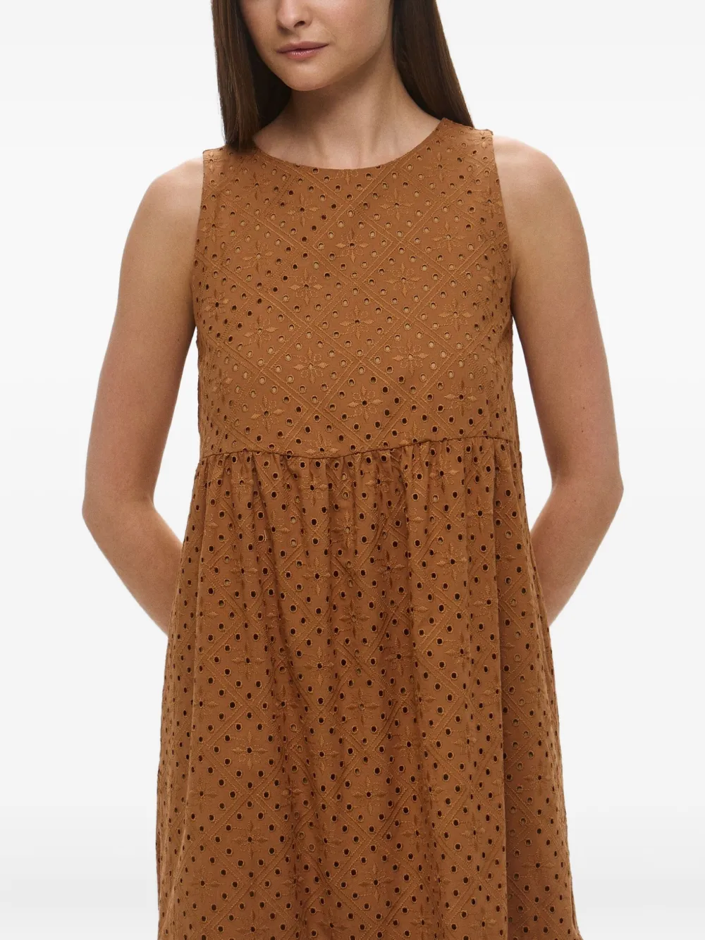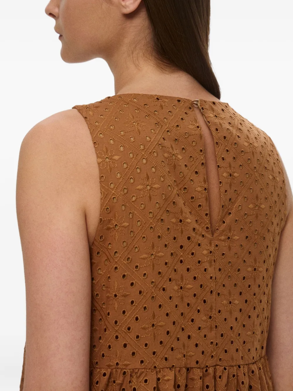 Светло-коричневая юбка с вышивкой в технике ажур, без рукавов, с круглым вырезом, многоярусная, с потайной молнией сзади
