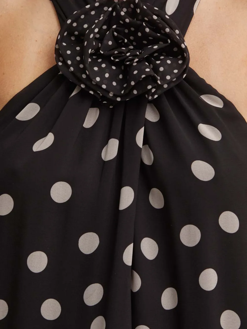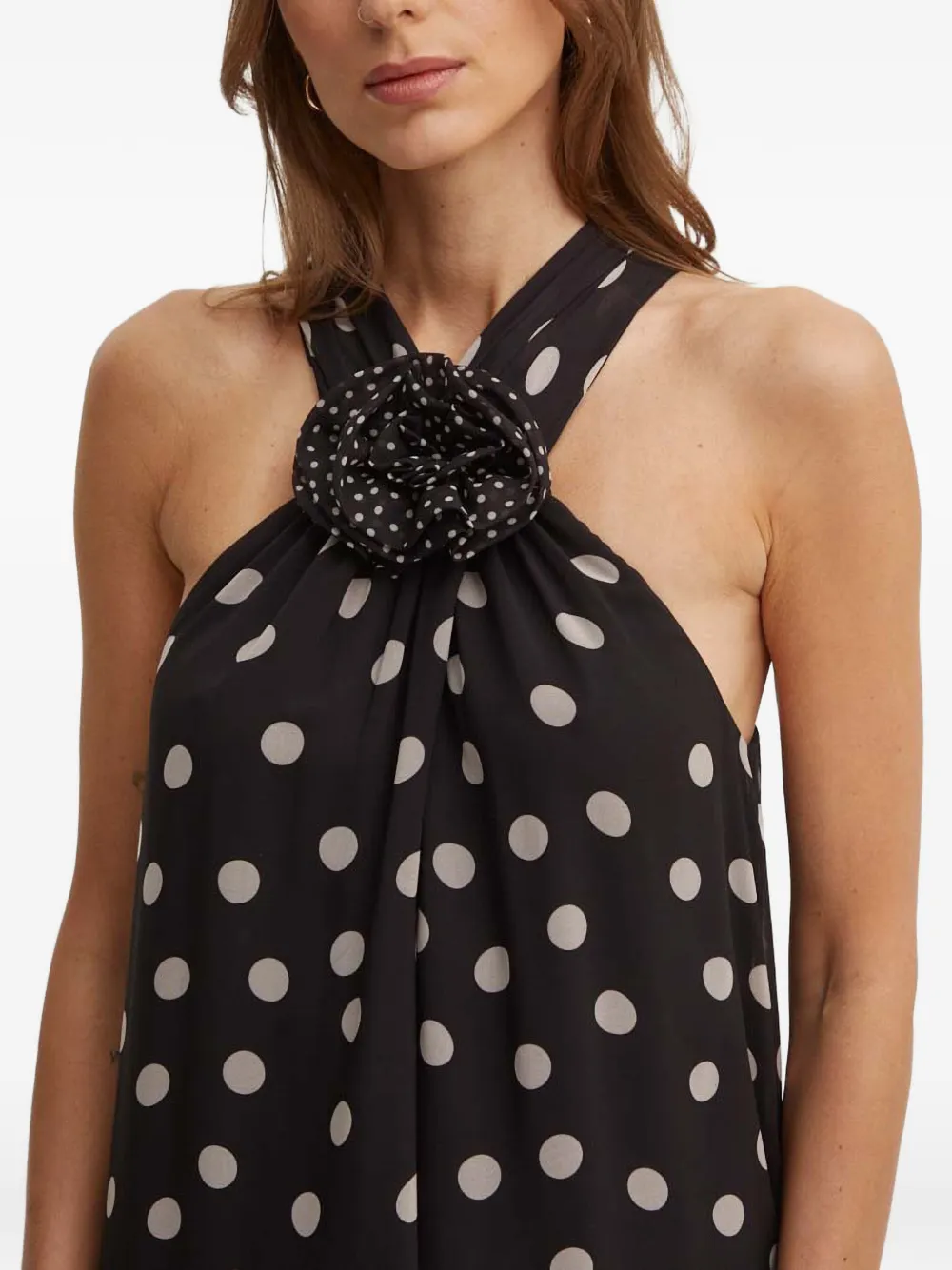 Черный топ с принтом в горох, розеткой и воротником-халтер, без рукавов