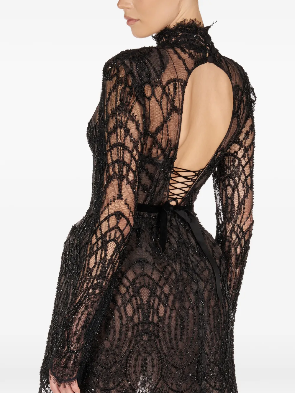 Черный наряд с бисерной отделкой, открытой спиной, высоким воротом, длинными рукавами и поясом