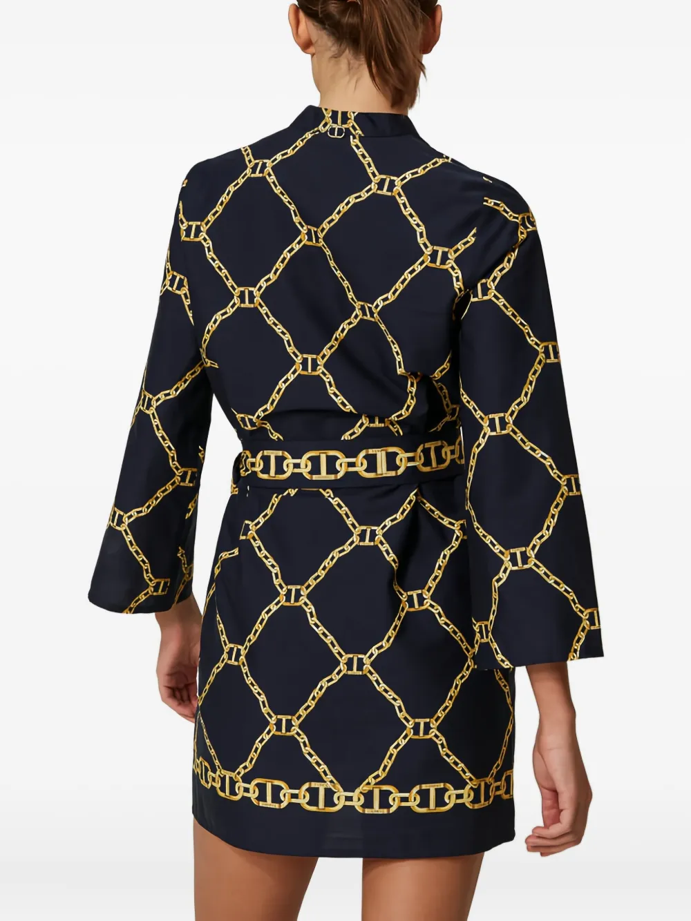 Темно-синяя рубашка с цепочным принтом, застежкой на пуговицы, рукавами три четверти, самозавязывающимся поясом и отложным воротником