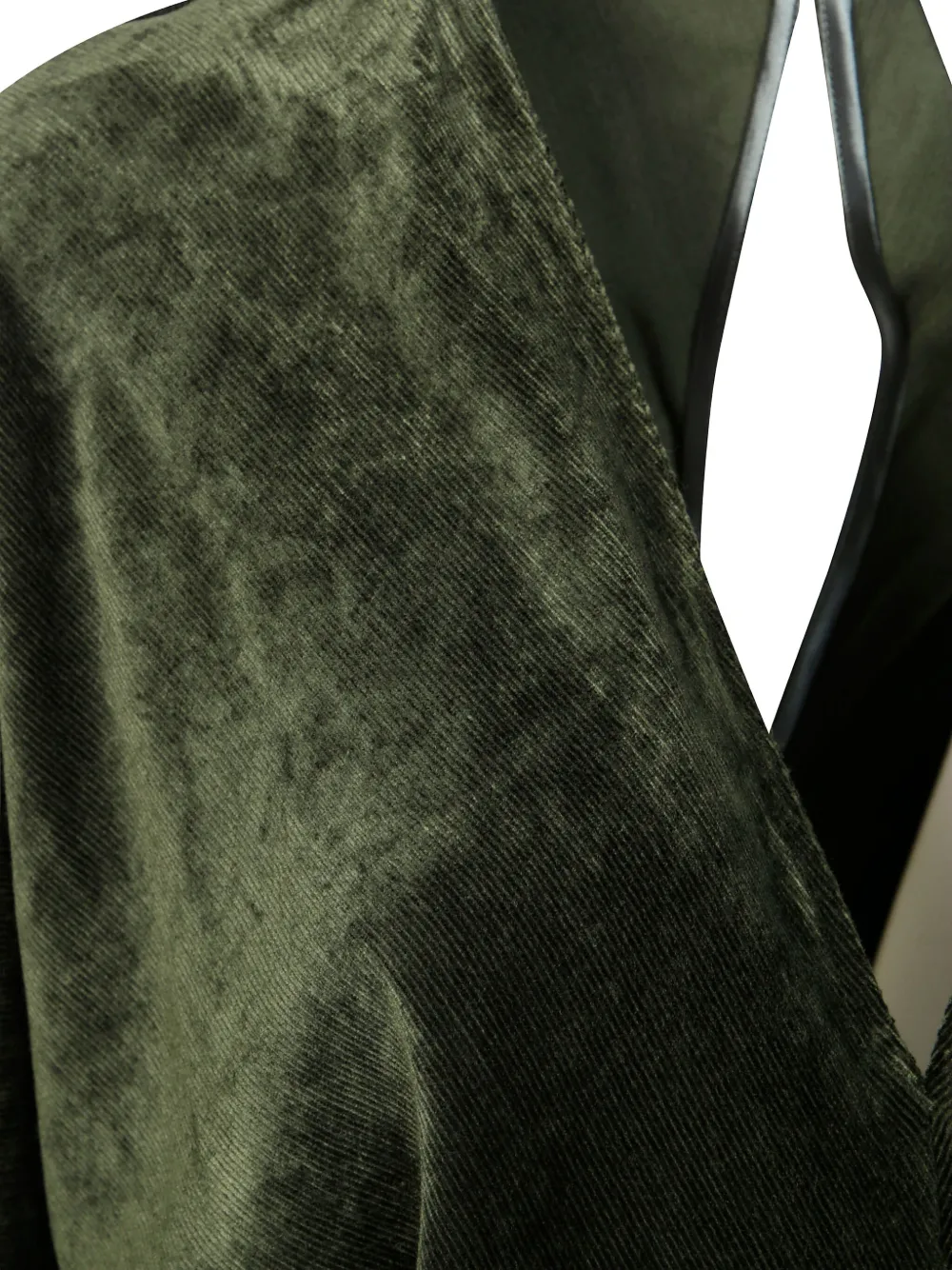 Темно-оливковый цвет, V-образный вырез, короткие рукава, отверстие-капля сзади, бархатистая текстура