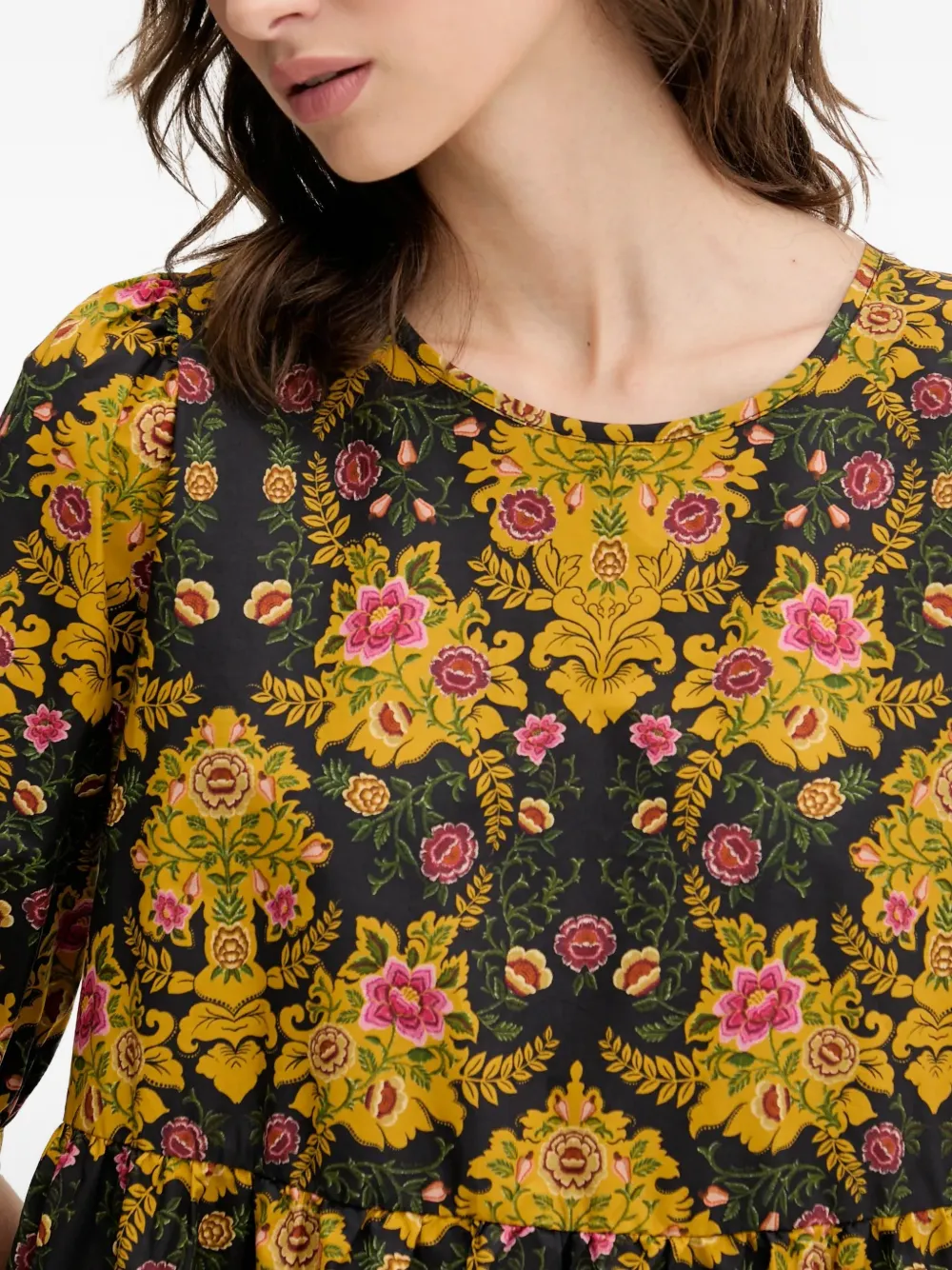 Черная блузка с цветочным узором, круглым вырезом, пышными рукавами и оборками