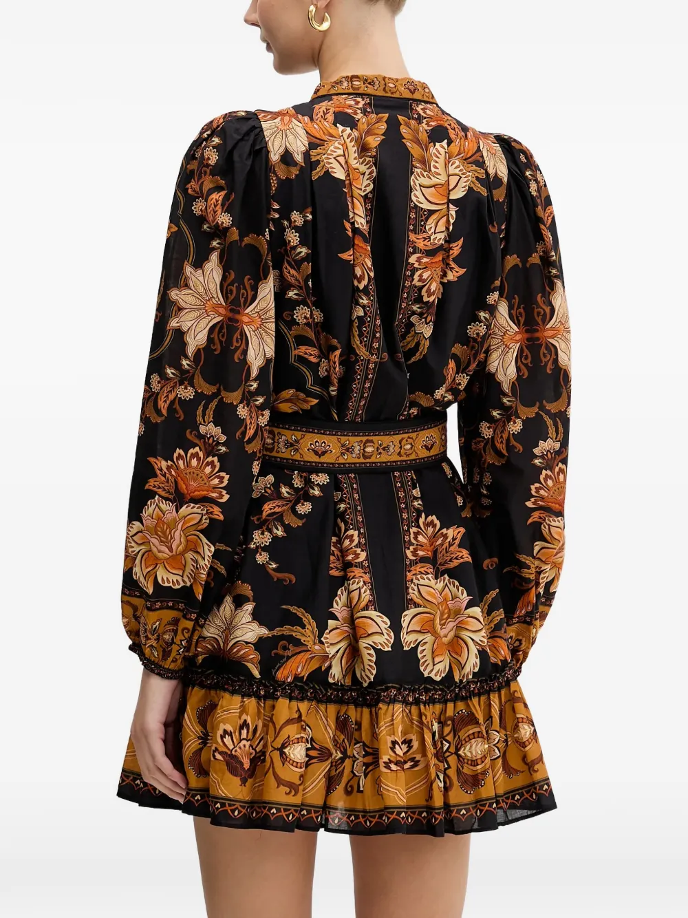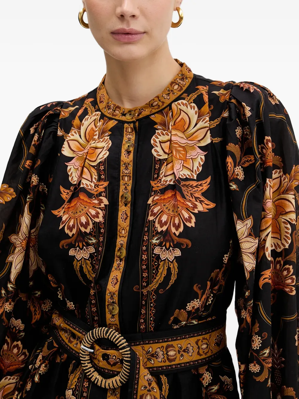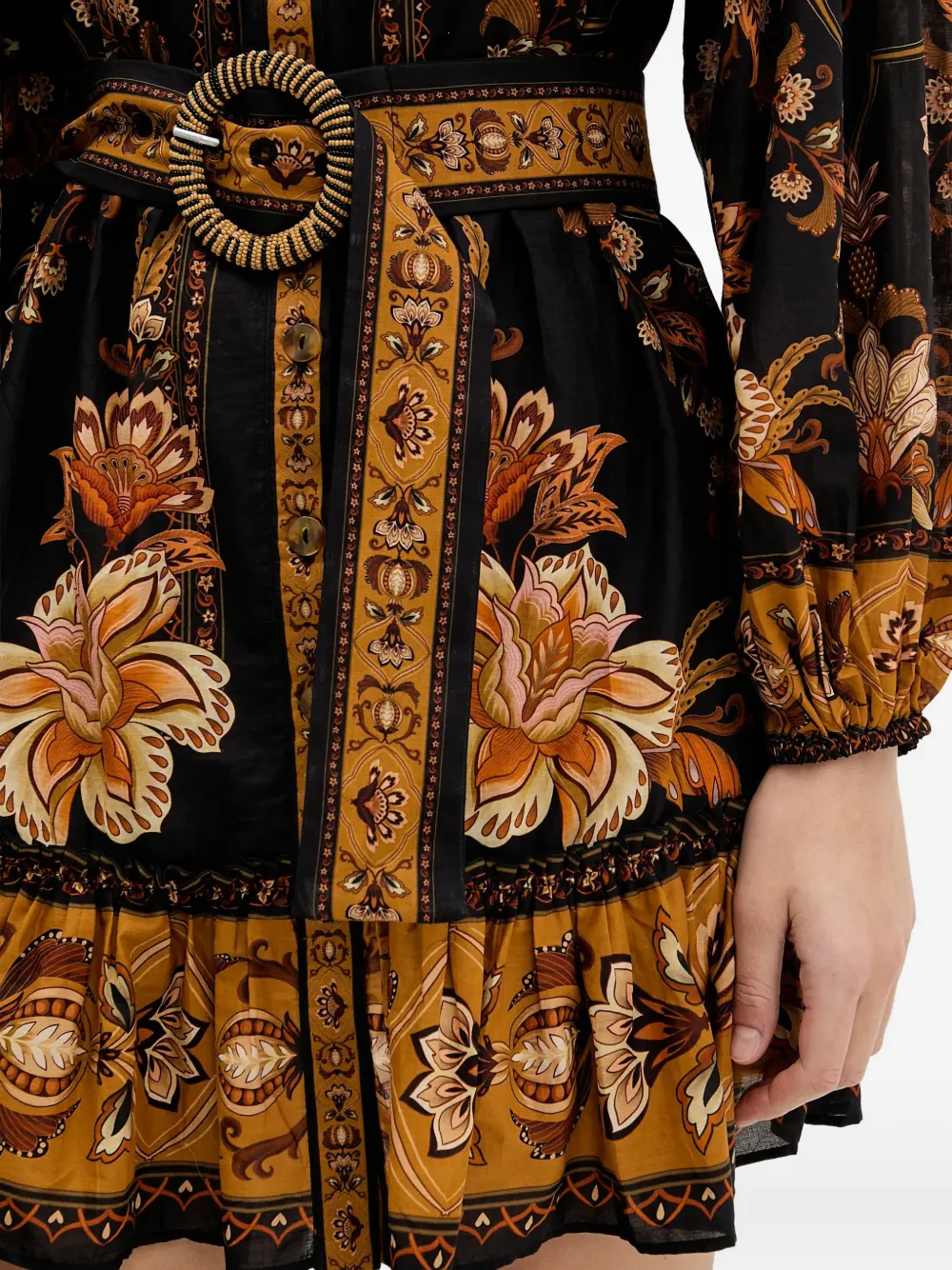 Черный/оранжевый с цветочным принтом, застежка на пуговицы, пояс на талии, длинные рукава, оборка по низу