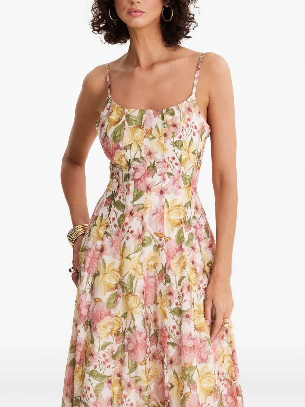 Бежевый, разноцветный цветочный принт, бретели-спагетти, квадратный вырез, плиссированные детали